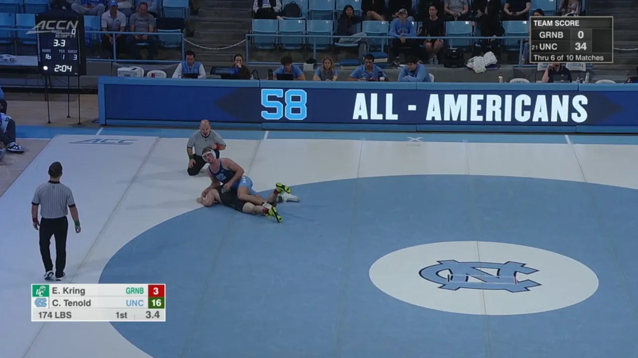 2025/26 North Carolin vs Greensboro wrestling dual 174lbs Cade Tenold (UNC) tech fall Ethan Kring (GC) I do not own this video, all credit/rights to ESPN/ACC