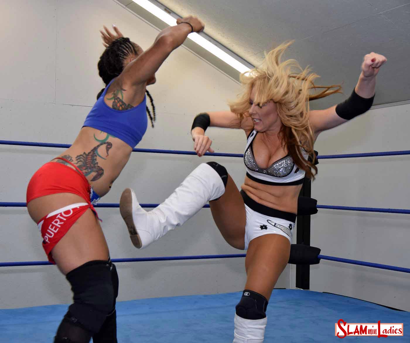 Amber says she's going to take La Rosa to school and launches a kick to Rosa's gut before she can lock up and follows that up with a Abdominal Stretch while pulling on La Rosa Negra's nose! La Rosa howls in pain and Amber locks in a Camel Clutch and keeps tugging on Rosa's nose. Amber then ups the cruelty with a Bow & Arrow hold while still pulling on Rosa's nose. Then Amber walks her over to the ropes and chokes her while still going for the nose. La Rosa tries to battle back but eats a big knee to the gut and is then subjected to a Surfboard. Amber then goes right back to the nose pulling and cranking the Camel Clutch until La Rosa finally taps in agony bringing this squash match to a close.