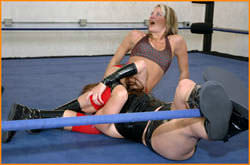 Malia dominates the early part of the match with Waistlocks, armwringers, a Side Headlock and a Clothesline. Sensing she's in trouble, Amy nails a low blow to try and shift the momentum in her favor. Noticing the referee let that one slide, Malia decides turnabout is fair play and lands a low blow of her own. Both ladies are eager to end the match as quickly as possible. A Small Package is reversed numerous times, Malia tries a Sunset Flip, Amy tries for a rope-assisted pinfall...with all pin attempts resulting in 2 counts. I dare anyone to find a match on the site that has more near falls than this one. These ladies are evenly matched! Further clarifying that point, a double shoulderblock knocks both grapplers down, as does a double faceplant. By the way, neither wrestler shies away from a little cheating either. Biting, choking, hairpulling...you name it. In the end, a final rollup out of the corner earns one lady the win, leaving her opponent in the ring less than satisfied.