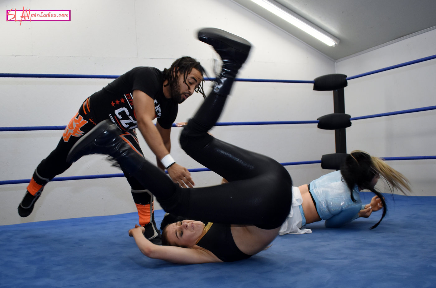 No your eyes aren’t deceiving you, that is Charli in Shazza’s gear-It’s her “scary Halloween costume”! Cade immediately wonders where the ref is and he has good reason too as without one both Jessica and Charli can double team him at will! It’s all Team Blue Nation early as Cade is chopped down to size in one corner and sent head over heels into the other! But when a planned double team goes badly its Jessica and Charli who on one the wrong end of the chops. Cade decides to introduce weapons into this ref-less environment, namely a hockey stick with a slap shot to Charli’s bum and Jessica taking a Spear and a cross check, no ref so no penalties on the play! But the Aussie’s prove quick and creative learners combing the stick with a traffic cone making Cade look like a dunce for introducing weapons into the fray. Maybe it’s Shazza’s gear, but for some reason Jessica and Charli aren’t always in sync and keep hitting each over giving Cade openings for some scintillating uppercuts and kicks! But when they are in sync their tandem offense is devastating. It’s another out of sync moment that leads to a decapitating upper cut to Charli, a light-dimming Superkick to Jessica and Cade’s secret weapon…an arm-breaking, DDT landing Frisbee! Things get even crazier as the introduction of a massive exercise ball has a direct effect on the outcome of this wild one!