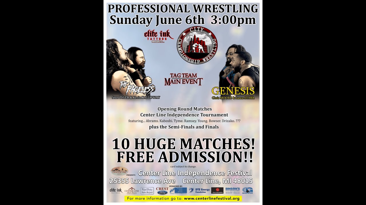 This was the very first time that the name of City Championship Wrestling graced the public eye. This acted as our "test event". It was a free event and it was a hot one outside, so hot in fact that many of the spectators watched on from the distance, under the shade! In the ring was a scorcher! Take glimpse of the epidemy of "crawl before you walk". CARD: Centerline Heritage Festival Tournament Quarter-Final: Freedom Ramsey vs. Jay Abrams Centerline Heritage Festival Tournament Quarter-Final: Andre Kabashi vs. A Mystery Opponent Movado vs. Nick Maus Centerline Heritage Festival Tournament Quarter-Final: Justin Tyme vs. Forever Young Centerline Heritage Festival Tournament Quarter-Final: Paul Bowser vs. Darion Ultra Mikey Mourner vs. Kyler Coleman vs. SOLO! Centerline Heritage Festival Tournament Semi Finals Centerline Heritage Festival Tournament Final MAIN EVENT: Genesis (Chris Moore and Lance Starr) vs. The Purge (Kevin Kalloway and Sean Tyler) You'll see a lot of faces that used to grace the CCW ring, still grace the ring and still may one day, return to the CCW ring.