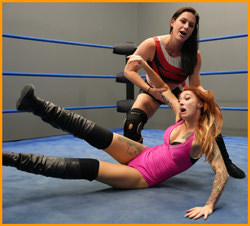 Kelsey is out cold face down on the mat as Jayme enters the ring to check out the latest (sorta) blonde she has paid to get beaten down. Jayme nudges Kelsey awake, lifts her up by her hair, then starts choking her with her own hair. It’s just the beginning of a long match for Kelsey, who barely gets in any offense while suffering insult and injury – and lots of hair pulls – at the hands of Jayme. Jayme puts Kelsey through a Camel Clutch with hairpull, Boston Crab with hairpull, and rope chokes assisted by hair chokes. When Jayme finally puts Kelsey out with a Sleeper, she grabs her hair and lifts her back up again, only to apply another submission hold that forces Kelsey to tap out, and allows Jayme to leave her exactly where she found her, face-down on the mat.