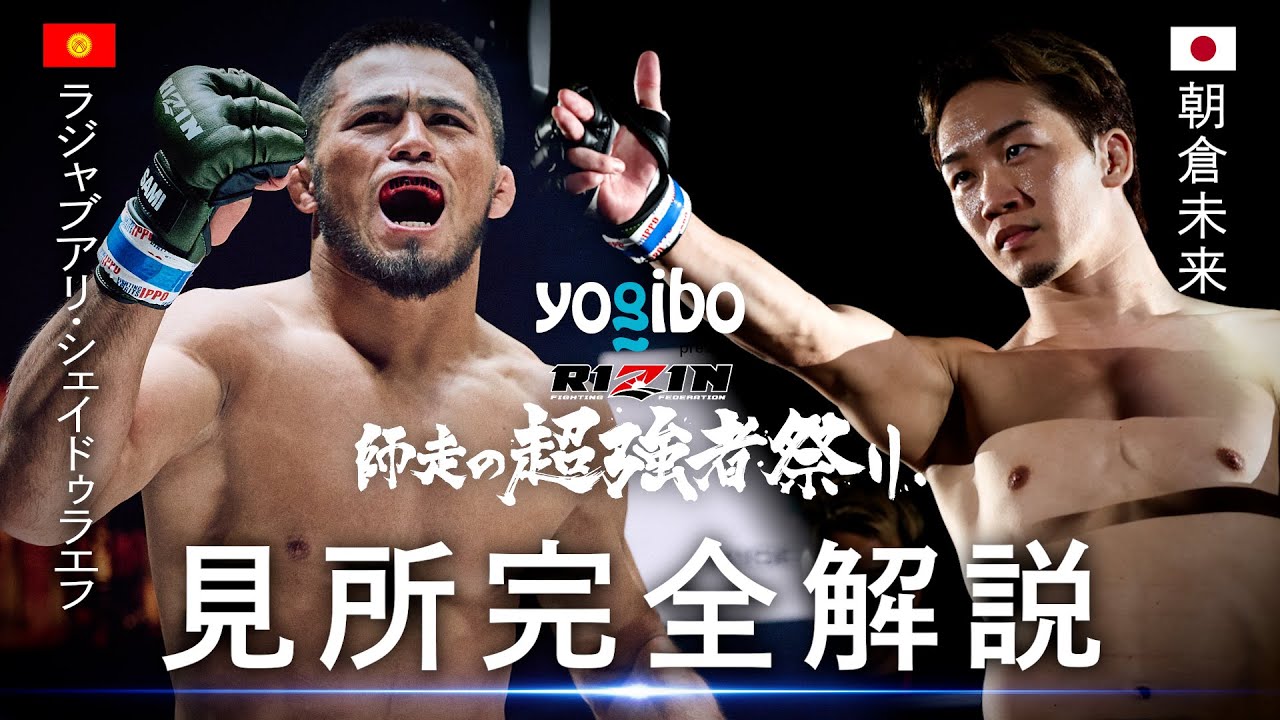 ▼チャプター 00:00 オープニング 01:18 RIZIN甲子園2025 決勝戦/須田雄律 vs. ヤマザト・エンゾ・マサミ 03:57 芦澤竜誠 vs.ジョリー 07:02 雑賀“ヤン坊”達也 vs. “ブラックパンサー”ベイノア 10:25 篠塚辰樹 vs. 冨澤大智 12:43 後藤丈治 vs. ホセ・トーレス 15:27 神龍誠 vs. ヒロヤ 19:53 カルシャガ・ダウトベック vs. 久保優太 22:42 秋元強真 vs. 新居すぐる 26:03 福田龍彌 vs. 安藤達也 30:24 クレベル・コイケ vs. ヴガール・ケラモフ 34:31 女子スーパーアトム級タイトルマッチ/伊澤星花 vs. RENA 38:05 バンタム級タイトルマッチ/井上直樹 vs. ダニー・サバテロ 42:19 フライ級タイトルマッチ/扇久保博正 vs. 元谷友貴 46:15 ライト級タイトルマッチ/ホベルト・サトシ・ソウザ vs. イルホム・ノジモフ 50:37 フェザー級タイトルマッチ/ラジャブアリ・シェイドゥラエフ vs. 朝倉未来 54:07 エンディング ——————————————— 🎁チャーリー柏木 限定グッズの応募はこちらから🎁 https://docs.google.com/forms/d/e/1FAIpQLScu7x3hGPwZvBotLoUPoy5SjB9Cqtb3r5qKH-0P7okgCvN97g/viewform ※応募条件あり ※詳細は応募フォームをご確認下さい ——————————————— ▼NEXT EVENT 「Yogibo presents RIZIN師走の超強者祭り」 in さいたまスーパーアリーナ スタジアムバージョン 2025年12月31日(水)11:00開場/ 13:00開始 https://jp.rizinff.com/_ct/17799885 ——————————————— ■RIZIN 100 CLUB会員募集中! RIZIN定額制動画配信サービス RIZINの過去の試合映像が見放題! 会員限定コンテンツも充実! 詳しくはこちらから▼ https://member.rizinff.com/ ——————————————— ▼Follow RIZIN FIGHTING FEDERATION Website: https://jp.rizinff.com/ Twitter: / rizin_pr Instagram: / rizin_pr LINE:https://lin.ee/obLA11b TikTok: / rizinffofficial ——————————————— #rizin師走の超強者祭り #RIZIN #朝倉未来