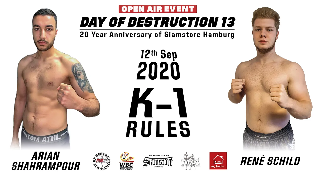 Kickboxing prelim fight under K-1 rules at Day of Destruction 13 between Arian Shahrampour from famous Tough Gym in Hamburg versus René Schild from the Kickboxing Team - Thürkau fighting out of Neustadt by Hanover. The DoD - Fight Series made his second Open Air event with this great show which had the motto "20 year Anniversary of Siamstore Hamburg"! This outdoor event stood under the patronage of the World Full Contact Association. Referee in charge of this fight was the very experienced Hendrik Schramm. The footage is copyright protected by Day of Destruction TV. Thanks for watching and visit us also on: Homepage: http://siamstore.de Facebook: https://m.facebook.com/Siamstore-1967... Instagram: http://instagram.com/team_day_of_dest... Twitter: https://mobile.twitter.com/DoD_Official #K1 #DayOfDestruction #kickboxing