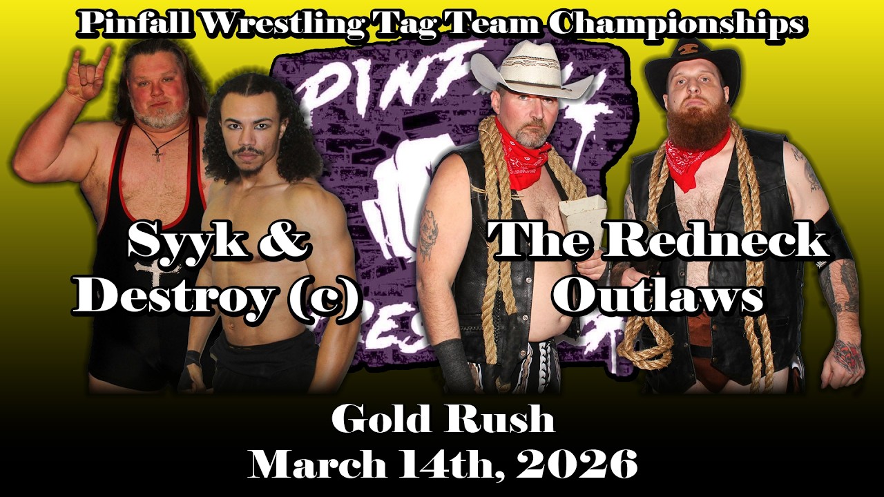 A very angry Tyler Bodine returns to Pinfall Wrestling, having joined forces with Big T, to take the Pinfall Wrestling Tag Team Titles off of his former partner, Bryan Ealey, and “The Seeker” Nakoa; titles which, Tyler claims, he never truly lost… Originally taped March 14, 2026 at "Gold Rush" Ring Announcer: Eric Roe Referee: Charles Grace Filming and Editing: Andrew Thannen Redneck Outlaws entrance music: [AI] Syyk & Destroy entrance music: [AI] Pinfall Wrestling claims no ownership of any copyrighted music used. All rights belong to their respective owners. Follow us on Facebook to stay updated on upcoming events: https://www.facebook.com/PWASpringfield
