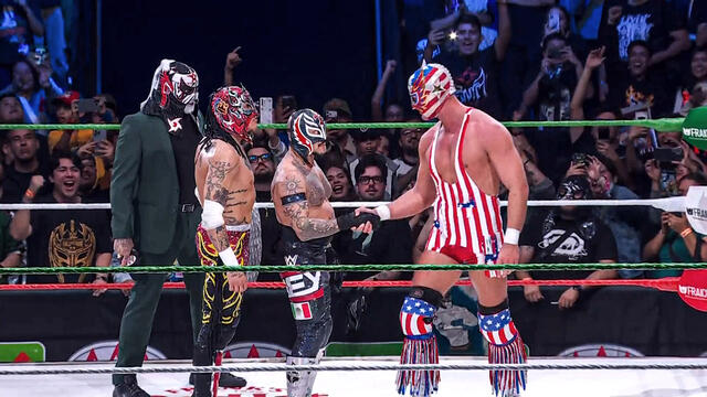 Rey Mysterio teams with Rey Fenix to take on El Grande Americano and AAA Mega Champion and Intercontinental Champion Dominik Mysterio. Catch WWE action on the ESPN App, Netflix, Peacock, USA Network, CW Network and more.