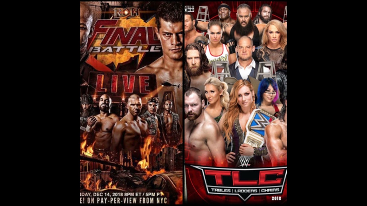 ROH Final Battle 2018 Match Card Kenny King vs. Eli Isom Jonathan Gresham vs. Zack Sabre Jr. Matt Taven vs. Dalton Castle Rights to ROH World Title Match Marty Scrull (c) vs Christopher Daniels I Quit Match Bully Ray vs. Flip Gordon ROH World TV Champion Jeff Cobb (c) vs. Adam Page Triple Threat Ladder War ROH Tag Titles SoCal Uncensored (Frankie Kazarian and Scorpio Sky)(c) vs. The Young Bucks vs. The Briscoes ROH Women Of Honor World Champion Sumie Sakai (c) vs. Madison Rayne vs. Karen Q vs. Kelly Klein ROH World Champion Jay Lethal (c) vs. Cody WWE TLC Match Card 2018 Tables Match Natalya vs. Ruby Riott Mixed Match Challenge Finals WWE Cruiserweight Championship Buddy Murphy (c) vs. Cedric Alexander Ladder Match with guitar hanging above the ring Elias vs. Bobby Lashley WWE Championship Daniel Bryan (c) vs. AJ Styles WWE SmackDown Tag Team Champions Triple Threat The Bar (c) vs. The Usos vs. The New Day WWE RAW Women’s Championship Ronda Rousey (c) vs. Nia Jax Finn Balor vs. Drew McIntyre TLC Match: Baron Corbin vs. Braun Strowman – If Strowman wins, he’ll challenge for the Universal Title at the Royal Rumble & Corbin loses all authority or if Corbin wins then he’s the permanent RAW GM. WWE Intercontinental Championship Seth Rollins (c) vs. Dean Ambrose WWE SmackDown Women’s Champion Triple Threat TLC Match Becky Lynch vs. Charlotte Flair vs. Asuka Follow all our podcasting and social media accounts for the latest news or just talk pro wrestling. twitter.com/EPWShow