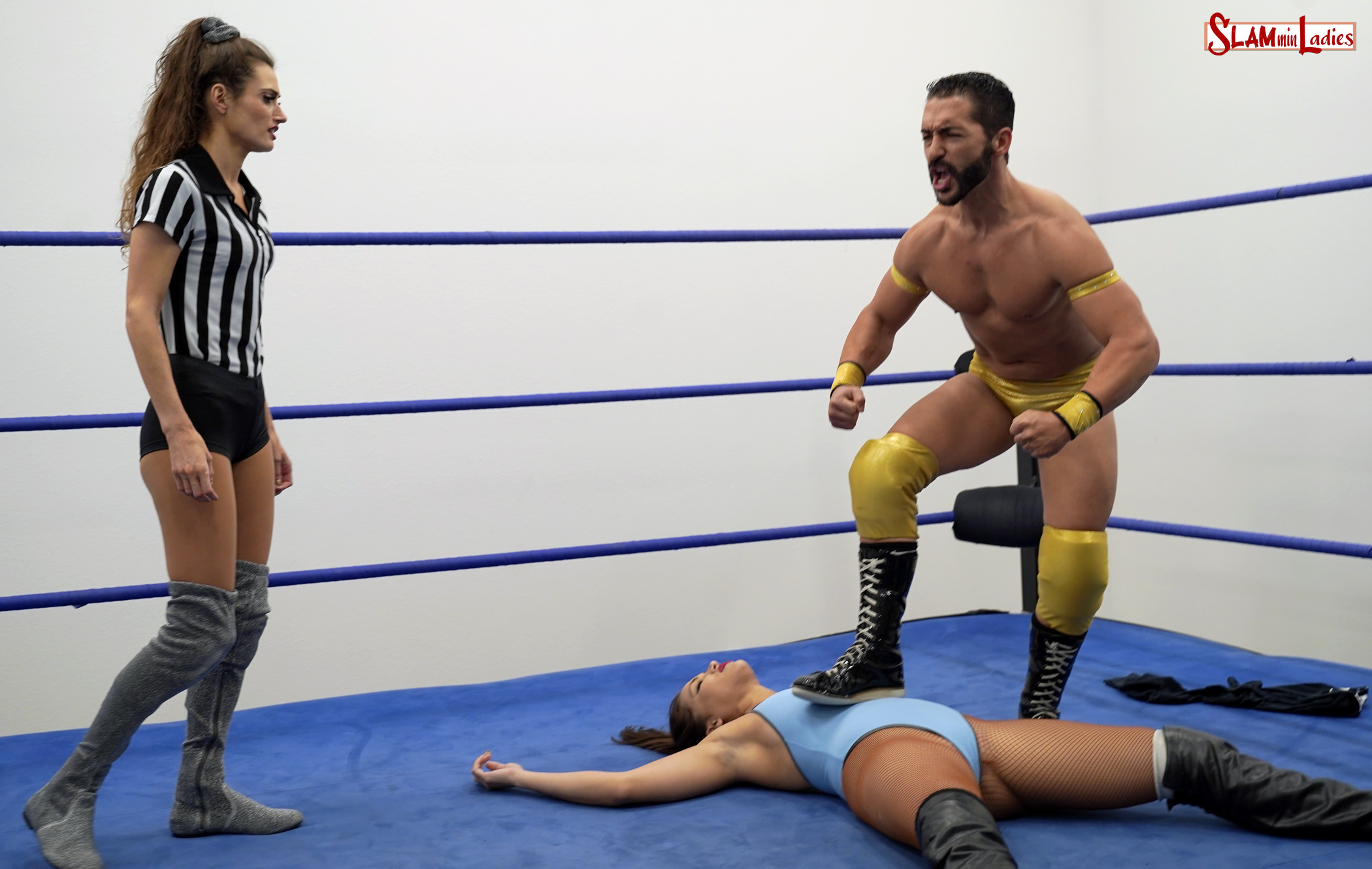 Amber Nova officiates for this 1 fall contest with Salina going up against the arrogant Chasyn. Chasyn immediately dismisses the 2 women, stating they should not be in a ring with him. This obviously does not go over too well, with Salina calling Chasyn a diva, and Amber pointing out that SLAMminLadies is actually owned by a female wrestler! Chasyn attacks Salina before the bell has even rung, locking her up for a Pedigree and dropping her face-first to the mat. Chasyn then wants to count his own pinfall, but that's where Amber draws the line. Nova pulls Rance off of de la Renta and then drops him with a Pedigree as well! Amber helps Salina up and encourages her to get some revenge on Chasyn. And that's exactly what happens, with Salina nailing Chasyn with no less than 7 Pedigrees! Salina covers Chasyn several times, but then decides to pull him up at the count of 2 to deliver some more punishment. The toughest part for Salina is now having to hoist up an unconscious Chasyn, but Amber is more than happy to help her out. Finally, an eighth Pedigree does it for the 1-2-3. Salina then talks some smack to Chasyn, but makes the mistake of mouthing off to Amber as well. Nova decides to hit Salina with a Pedigree too, just as Chasyn is waking up. The timing could not be worse for Salina, who ends up being Pedigreed once more before being dropped on her head with a Tombstone Piledriver.