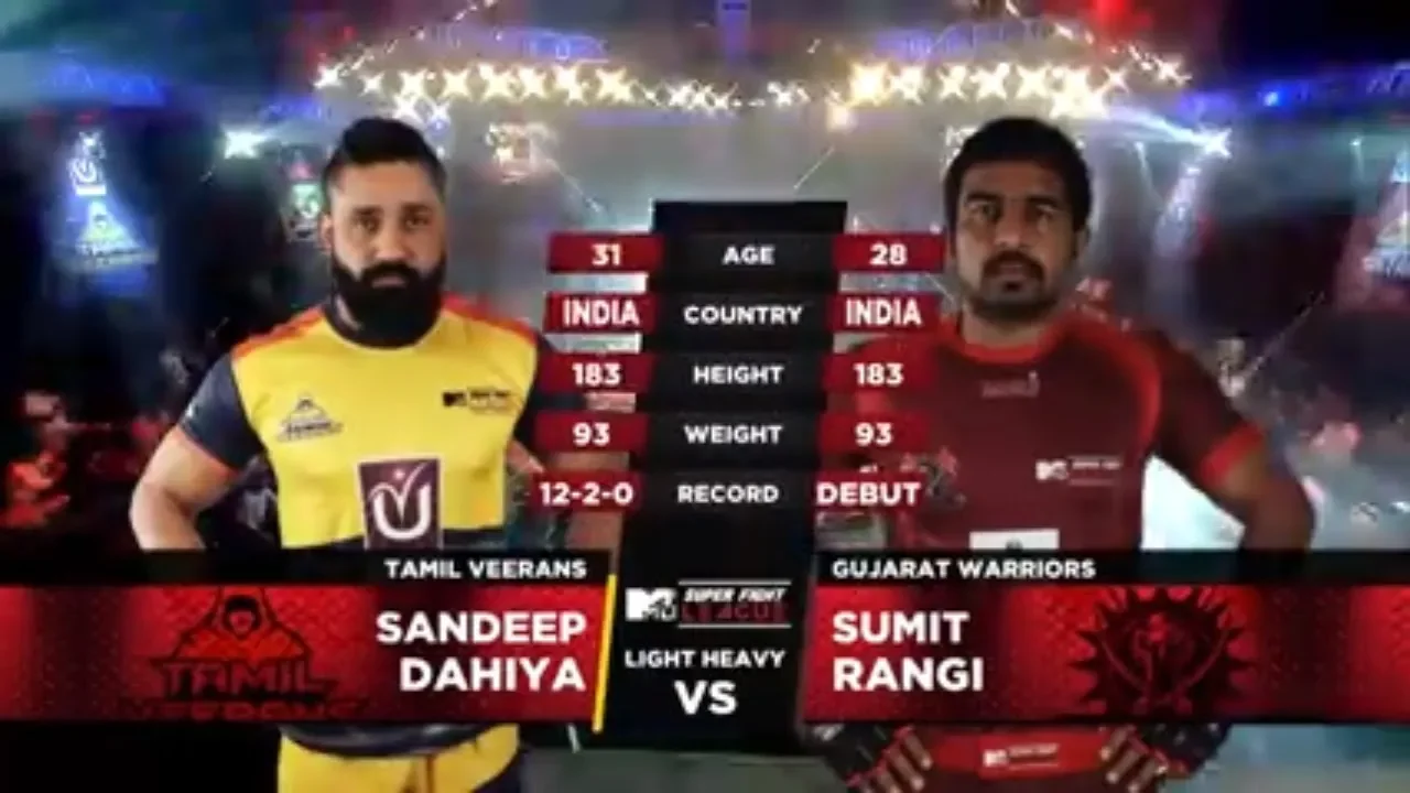 MTV Super Fight League Season II. Do not miss out the super exciting fight between light heavyweights Sandeep Dahiya and Sumit Rangi, Tamil Veerans Vs Gujarat Warriors. Super Fight League is the world’s 1st and only mixed martial arts league. Our management’s out of the box thinking, led to the introduction of MMA in a league format, which has never been done before by any combat sports organization. Subscribe our channel for all the latest updates. Website: http://www.superfightleague.com/ Facebook: https://www.facebook.com/SuperFightLeague/ Twitter: https://twitter.com/TheFightLeague Instagram: https://www.instagram.com/superfightleague/ #Fight #FightLeague #Fighting #SFL #Youtube #MTV #MMA #IndianMMA