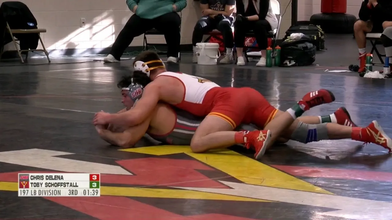 2025/26 VMI vs Sacred Heart wrestling dual 197lbs Toby Schoffstall (VMI) dec Chris DeLena (SH) I do not own this video, all credit/rights to ESPN/SoCon