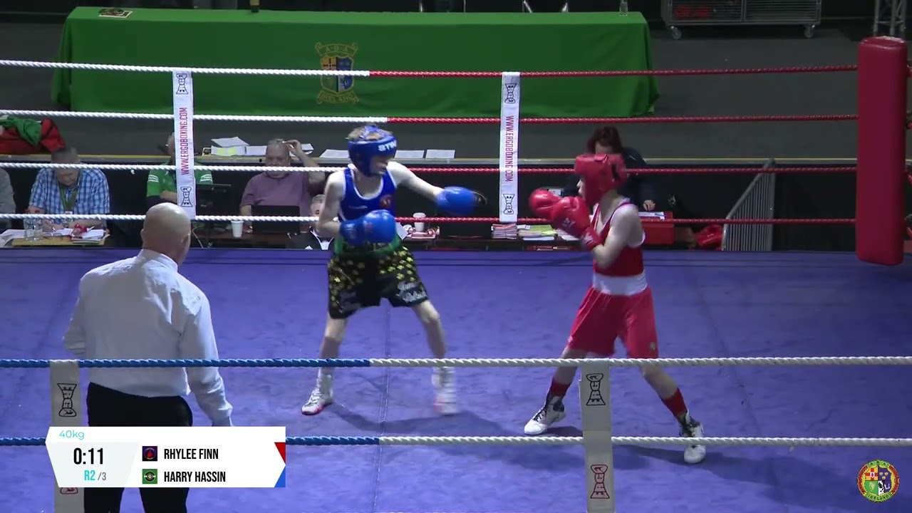 Rhylee Finn (St Nicholas) and Harry Hassin (St John Bosco A) contest this 2024 National BG3 Championship 40kg quarter final, streamed by @streamsport-ie7508 #boxing #boxingireland #boxer #irishboxing #IABA #olympicsport #iaba #bout #fight #titleboxing #bout #championshipboxing
