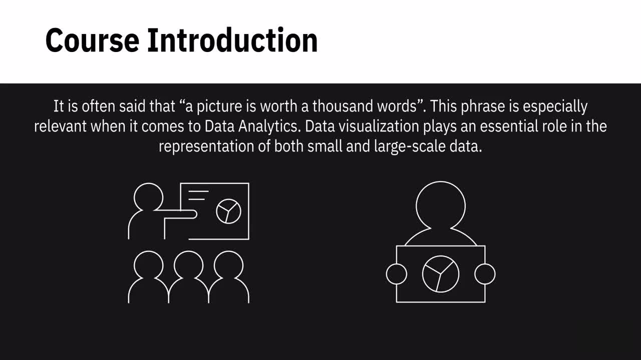 Learn how to create data visualizations and dashboards using spreadsheets and analytics tools. This course covers some of the first steps for telling a compelling story with your data using various types of charts and graphs. You'll learn the basics of visualizing data with Excel and IBM Cognos Analytics without having to write any code. You'll start by creating simple charts in Excel such as line, pie and bar charts. You will then create more advanced visualizations with Treemaps, Scatter Charts, Histograms, Filled Map Charts, and Sparklines. Next you’ll also work with the Excel PivotChart feature as well as assemble several visualizations in an Excel dashboard. This course also teaches you how to use business intelligence (BI) tools like Cognos Analytics to create interactive dashboards. By the end of the course you will have an appreciation for the key role that data visualizations play in communicating your data analysis findings, and the ability to effectively create them. Throughout this course there will be numerous hands-on labs to help you develop practical experience for working with Excel and Cognos. There is also a final project in which you’ll create a set of data visualizations and an interactive dashboard to add to your portfolio, which you can share with peers, professional communities or prospective employers.