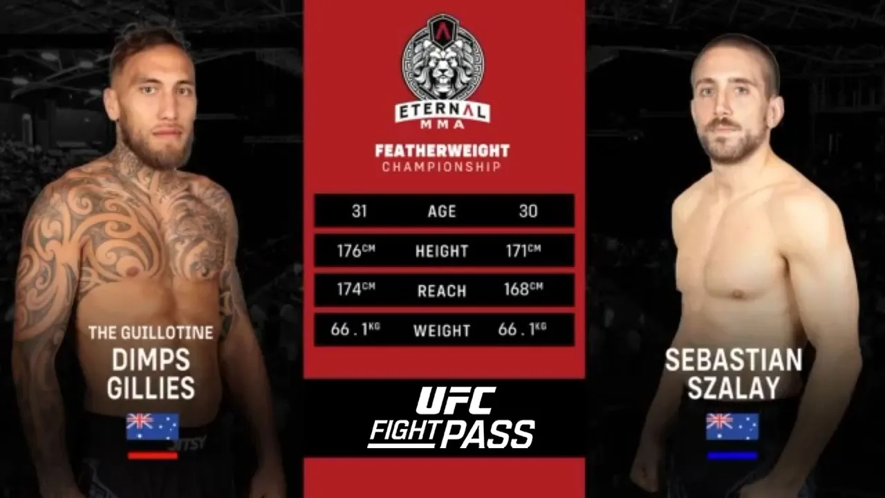 Sebastian Szalay vs Dimps Gillies at Eternal 87 from Perth, Australia on August 17, 2024 Experience UFC live, 200+ Live Events, the World's Largest Combat Sports Library, Originals, Podcasts and more with UFC FIGHT PASS, the digital subscription service of the UFC. Sign Up Now: https://ufc.ac/3AofDIW Subscribe to get all the latest UFC content: https://bit.ly/3TkkHGX Connect with UFC FIGHT PASS on Social: π΅ Twitter: https://www.twitter.com/ufcfightpass π΅ Facebook: https://www.facebook.com/ufcfightpass π΄ Instagram: https://www.instagram.com/ufcfightpass π΄ TikTok: https://www.tiktok.com/@ufcfightpass #ufc #ufcfightpass #ufcbjj #pridefc #wec #strikeforce