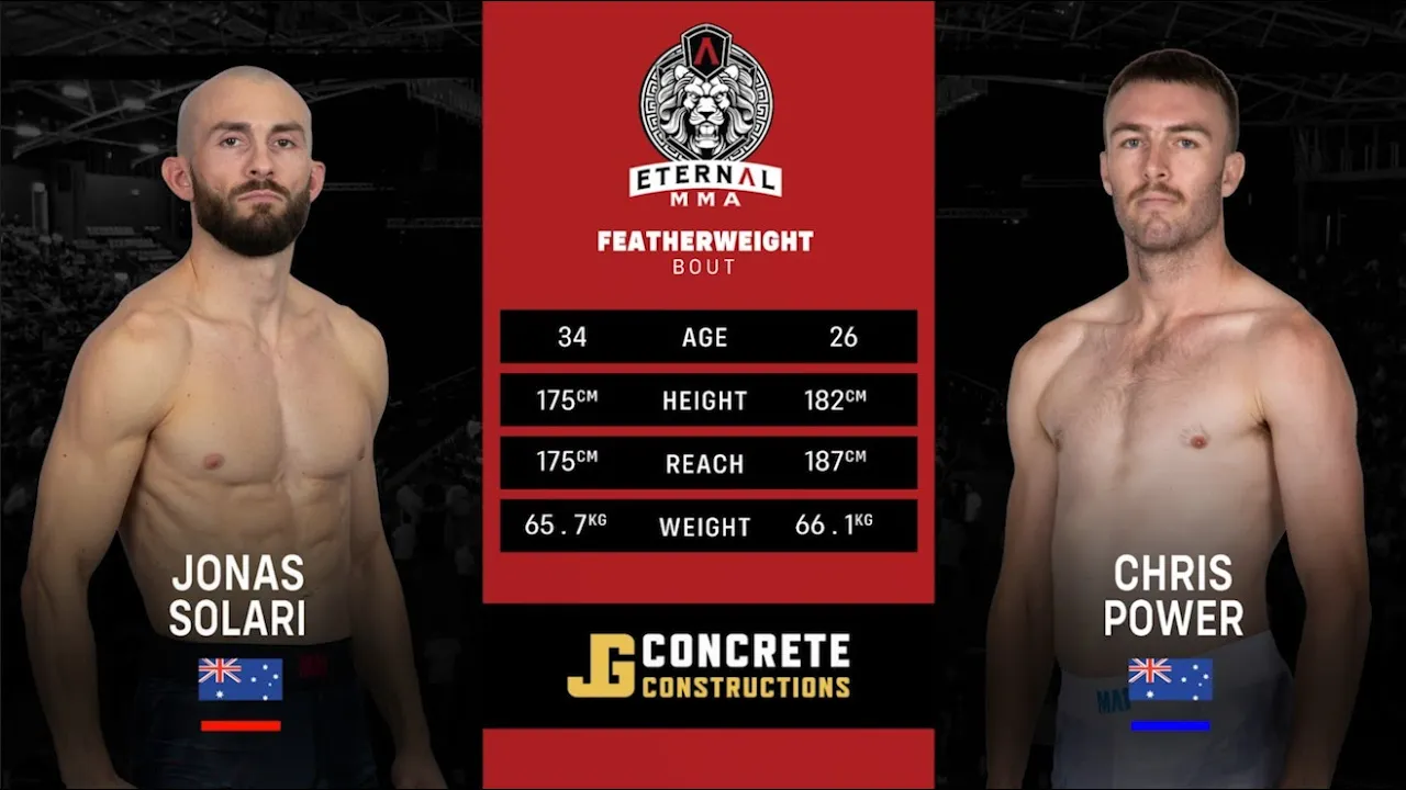 🔥 Welcome to Eternal MMA 100 ! 🔥 Watch as Jonas Solari takes on Chris Power in a thrilling matchup that showcases the best of Australian mixed martial arts! Eternal MMA is proud to be Australia and New Zealand's premier MMA promotion, bringing you the most electrifying fights from across the region. 🌟 About Eternal MMA: Based on Queensland's Gold Coast, we promote up to 11 events per year, featuring a talent pool filled with the finest MMA athletes, from rising amateurs to seasoned pros. Our events are known for their intensity, with undercards showcasing top amateur fighters from the Australia-Pacific region, and main cards packed with professional athletes in the most competitive bouts. 💥 Why You Should Watch: - Experience the excitement of live MMA action. - Discover the future stars of the sport. - Enjoy exclusive highlights, KO's, TKO's, and submission victories! 👉 Don't forget to subscribe to the Eternal MMA YouTube channel for all the latest fights and highlights, including full fight recaps, behind-the-scenes content, and more! Follow Us: - Facebook: Eternal MMA - Instagram: @EternalMMA - TikTok: @eternalmma - OnlyFans: Eternal MMA - Threads: @eternalmma 🌐 For more information, visit www.eternalmma.com. Join the conversation using hashtags: #EternalMMA #MMA #FightNight #AustralianMMA #FullFight #UFC #UFCFightPass