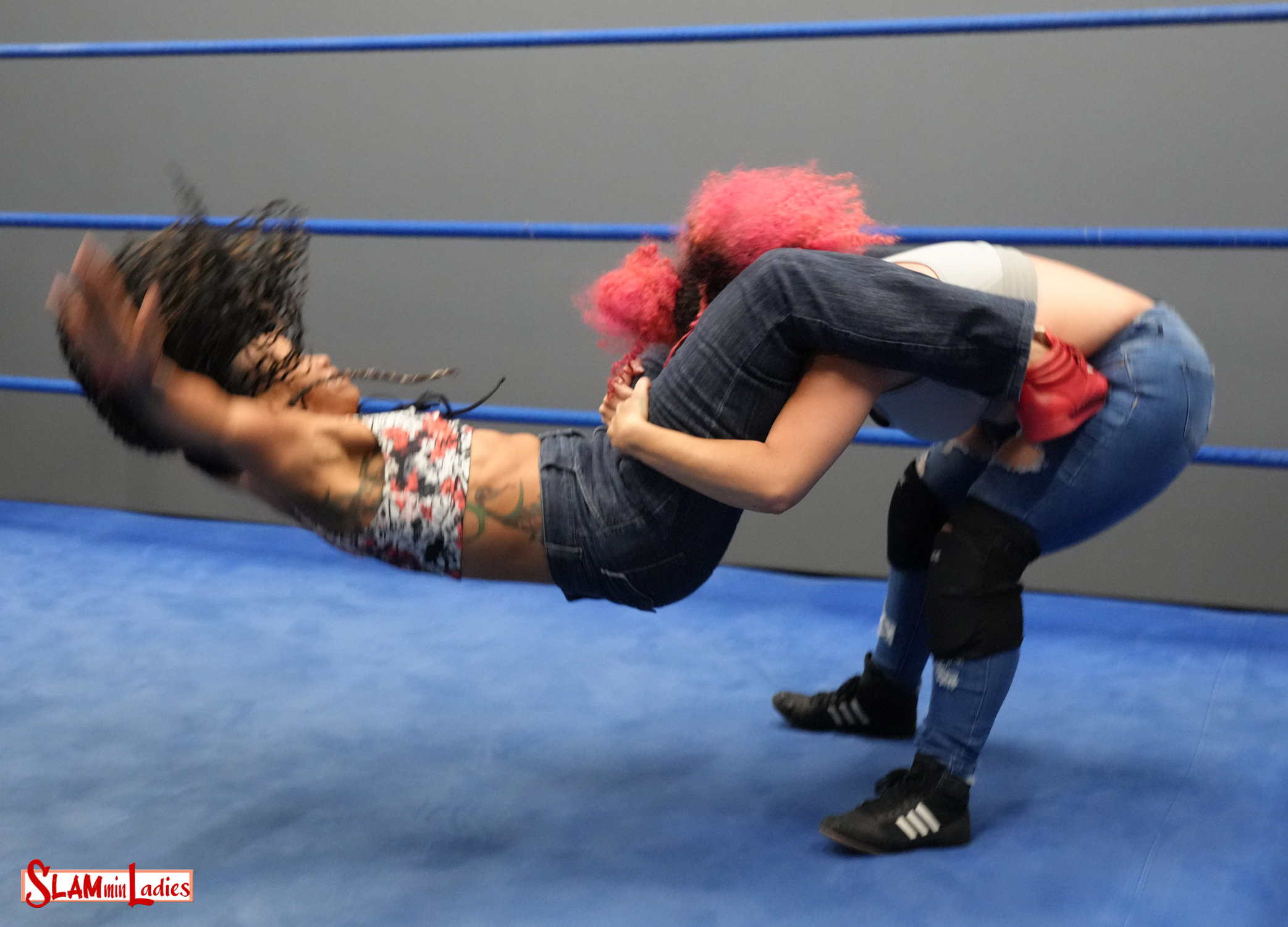 Katalina and La Rosa come to battle in street clothes in this 1 Fall matchup. And that’s fitting, because this hard-hitting battle could just as easily be a street fight as a wrestling match. La Rosa opens with a flurry of forearms, stomps, and chokes against the turnbuckles. She follows up by attacking Katalina’s right leg, stomping on it and applying a one-legged Boston Crab, then working it into a double-leglock with a bridging Chinlock. Katalina yanks at La Rosa’s hair to force the break, then follows up with a chinbreaker and a running splash in the corner. La Rosa grabs Katalina in a Bearhug and a bodyscissors on the mat that she transitions into a double Chickenwing Surfboard hold. Katalina escapes and nails La Rosa with a Sidewalk Slam, but can only score a 2 count. She fires away with fists, but a pair of La Rosa Headbutts stop her in her tracks. La Rosa climbs to the top turnbuckle in an attempt to end the match. A 3 count is imminent, but for which grappler?