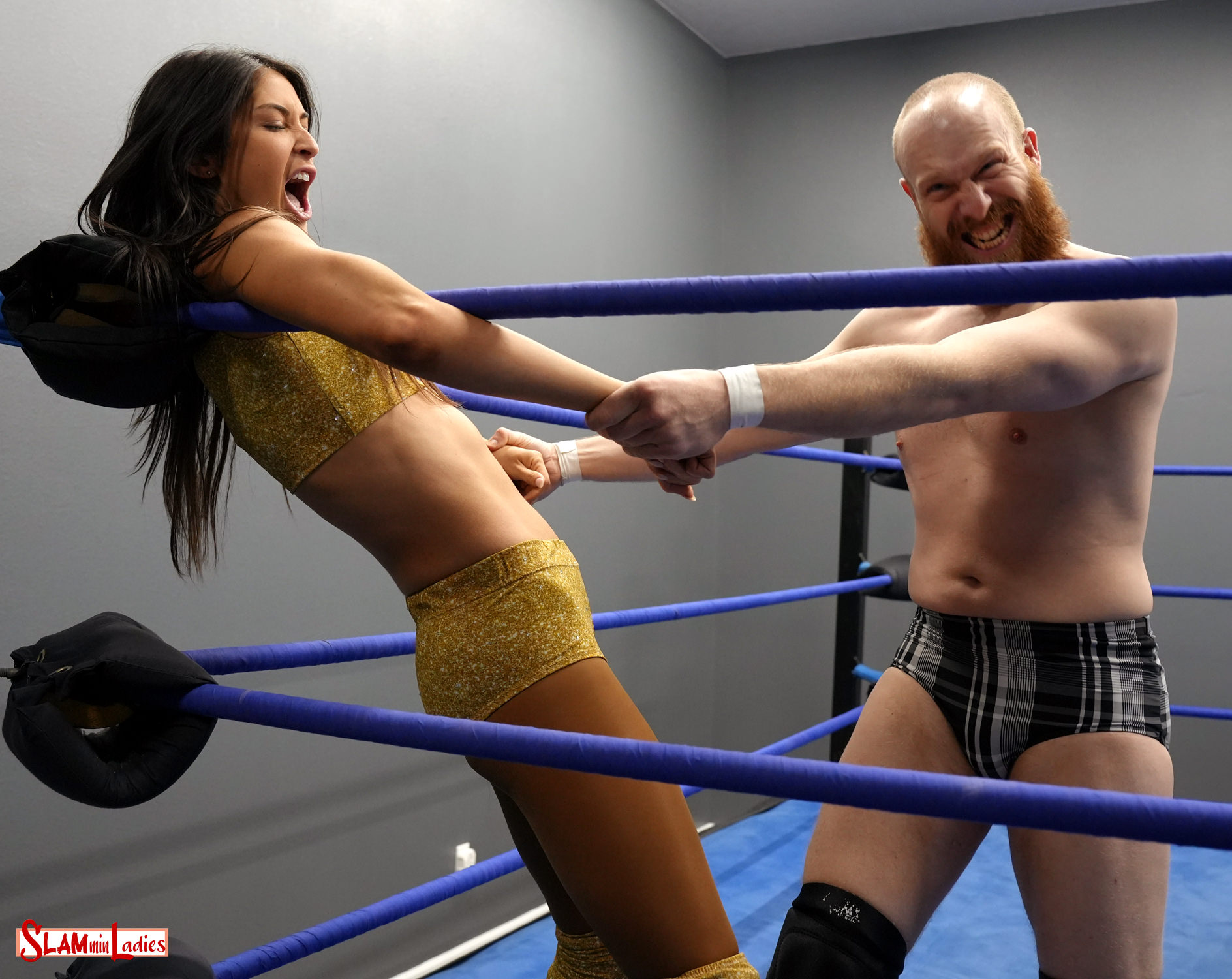 After some early armbars and headlocks during the opening moments of this 1 Fall match-up, Chico delivers a knee to Kellie’s gut, slams her face-first into the top turnbuckle and rakes her eyes across the top rope. Kellie returns the favor, slamming Chico’s face into the turnbuckle, then choking him with her foot before draping his throat across the middle rope and choking him against the ropes as well. Chico escapes with a kick to the gut and a Headbutt, then whips Kellie into the corner and nails her with a running shoulderblock. Chico again rakes Kellie’s eyes across the top rope, but an Irish Whip turns the tide as Kellie ducks a blow and locks on a Rear Naked Chokehold. Chico tries to back into the corner, but Kellie maintains the hold. Can Chico find a way out, or is it lights out?
