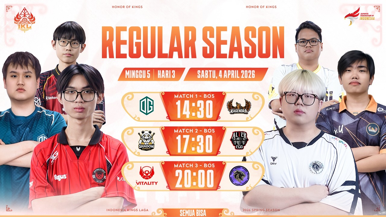 Hari terakhir babak Regular Season IKL Spring 2026! Pertandingan penutup yang akan menentukan posisi final semua tim di musim ini. Regular Season Minggu 5 Hari 3 Match 1: 14:30 WIB | BO5 | OG vs. KAGE Match 2: 17:30 WIB | BO5 | SE vs. AE Match 3: 20:00 WIB | BO5 | BTR vs. DMT Siapakah yang akan keluar sebagai pemimpin klasemen di akhir musim reguler? Follow Instagram HOK ESPORTS ID untuk Informasi selengkapnya mengenai turnamen ini! 🔗instagram.com/hok.esports.id Mainkan Honor of Kings sekarang! 🔗https://hokesports.com/IKL #SemuaBisa #IKL #IKLSPRING #IndonesiaKingsLaga #HOKID #HonorOfKings #HonorOfKingsIndonesia #2026HOK #MOBAFOREVERYONE