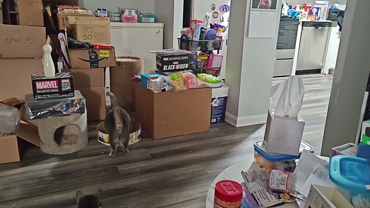 Phoebe figuring out how her new scratch pad/toy works while Pounce audits