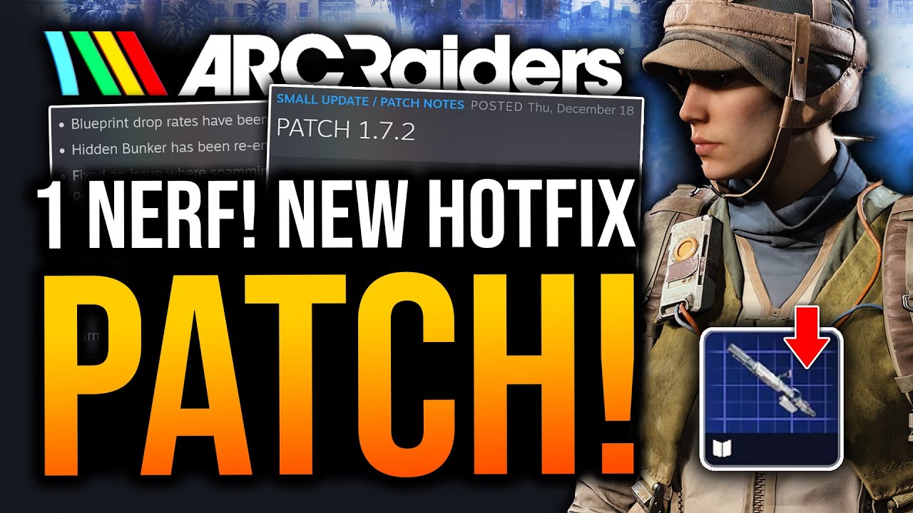 Hey, let's talk Arc Raiders News! Update 1.7.2 with Patch Notes, it includes Blueprint Nerf, Bug Fixes, Cosmetic Found & more! https://youtu.be/Ckcjb7WxAZw 0:00 New Patch Update 0:23 Blueprint Nerf Slightly 1:02 Five Bug Fixes 2:57 Awesome It Syncs Up 3:54 This is Really Insane 4:58 New Cosmetic Last Patch 5:55 Round Feedback Improved 6:46 I Haven't Found This Yet 7:10 Devs on Matchmaking 8:43 Expedition Worth it or no? 9:16 Top Comments 10:02 What do you think? ❌ Follow ► https://x.com/GlitchUnltd 🎮My Discord ► https://discord.gg/H6x3yTpV3x 📸 Follow ► https://www.instagram.com/glitch_unlimited/ 🤝Join Membership► https://www.youtube.com/channel/UCcnkqkNWjiwLcDUx0WshOmg/join _____________________________________ 🎮 What's this game? The Embark Studios Wrote ' ARC Raiders is an upcoming multiplayer, extraction adventure, set in a lethal future earth, ravaged by a mysterious mechanized threat known as ARC. In ARC Raiders, gameplay flows between the surface ruled by lethal machines, and the vibrant underground society of Speranza. Craft, repair, and upgrade your gear in the safety of your own workshop, before venturing topside to scavenge the remnants of a devastated but beautiful world. Play solo or in parties up to three, navigating the constant threat of ARC's machines and the unpredictable choices of fellow survivors. ' _____________________________________ Thanks for Watching #arcraiders // #gamingnews