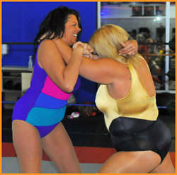 We present to you not 1, not 2, but 3 pioneers of female wrestling. It's Candi Divine going up against Diane Von Hoffman and it's up to Lexie Fyfe to referee these two wildcats. That's not going to be easy since Candi and Diane know every trick in the book (and some are even legal!). Traditional moves like headlocks and armwringers are countered by non-traditional bites and hairpulls. Candi has Diane on the ropes early on, but the crafty Diane isn't going down without a fight. She pleads to her fellow competitor of 20 years to give her a break. You think Candi might have learned how Diane works by now! Diane swiftly takes advantage of her old adversary's moment of weakness. She chokes and yanks and chokes some more and Lexie just can't seem to keep up with Diane's cheating ways. Hey, we never said the ref's job was easy! Diane shows no respect for the rules and does everything she can to try and cause permanent damage to The Divine One. Candi fights back and manages to connect on some old school Keister Bounces. After a hard Snapmare, Diane finally decides that she's had enough. The action spills to the outside of the ring and after everything goes to hell in a handbasket, it's up to Lexie to sort out the mayhem.
