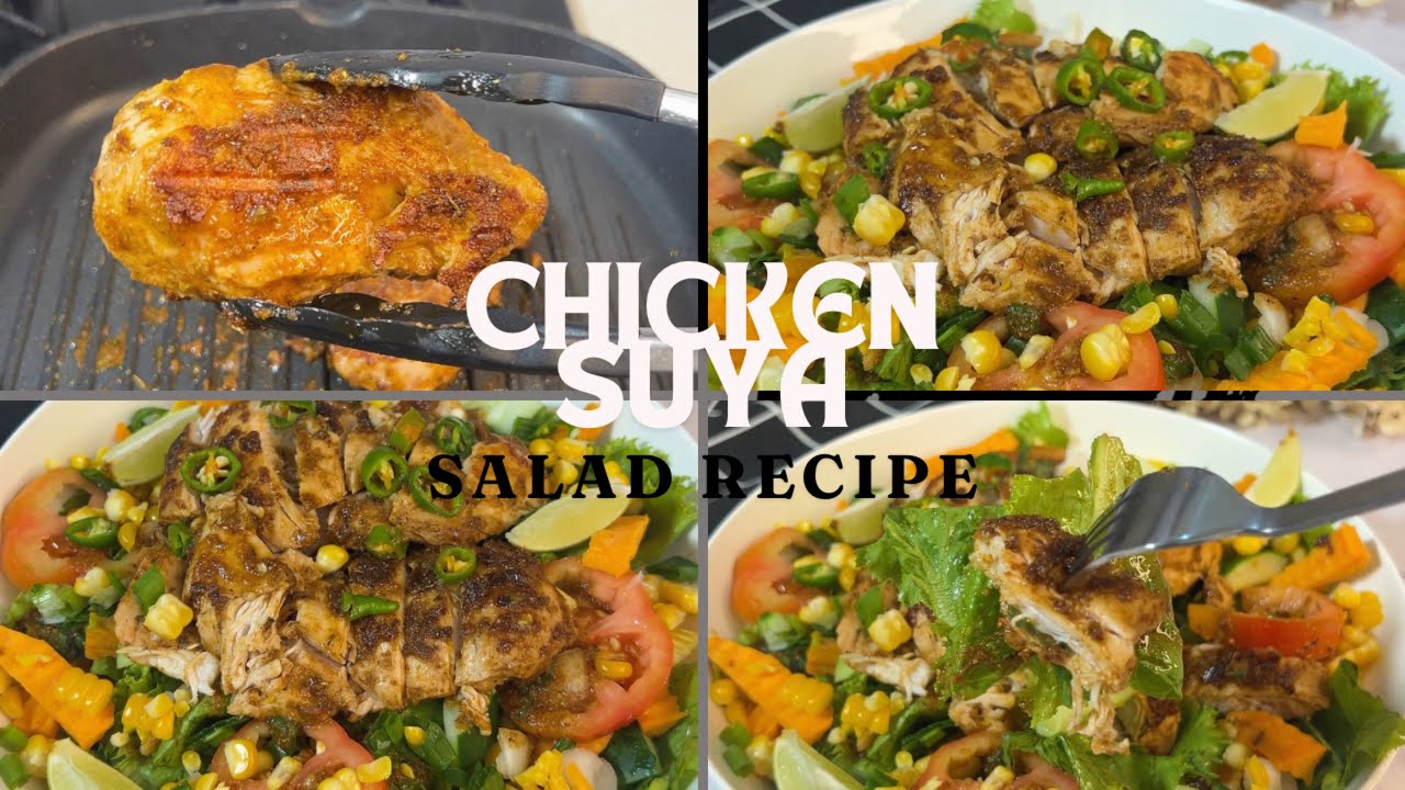 This chicken Suya Salad is so filling and delicious 🤤 Ingredients 1. Salad dressing Olive oil Suya spice Pinch of black pepper Pinch of chicken bouillon powder Salt to taste 2. Chicken Chicken breast Olive oil Paprika , ginger garlic powder Black pepper Parsely and thyme Salt Chicken bouillon powder 3. Veggies and others Lettuce Carrot Sweet corn Tomato Spring onions Green chillies And others as seen in the video #chefamors #chickensalad #chicken #amorians