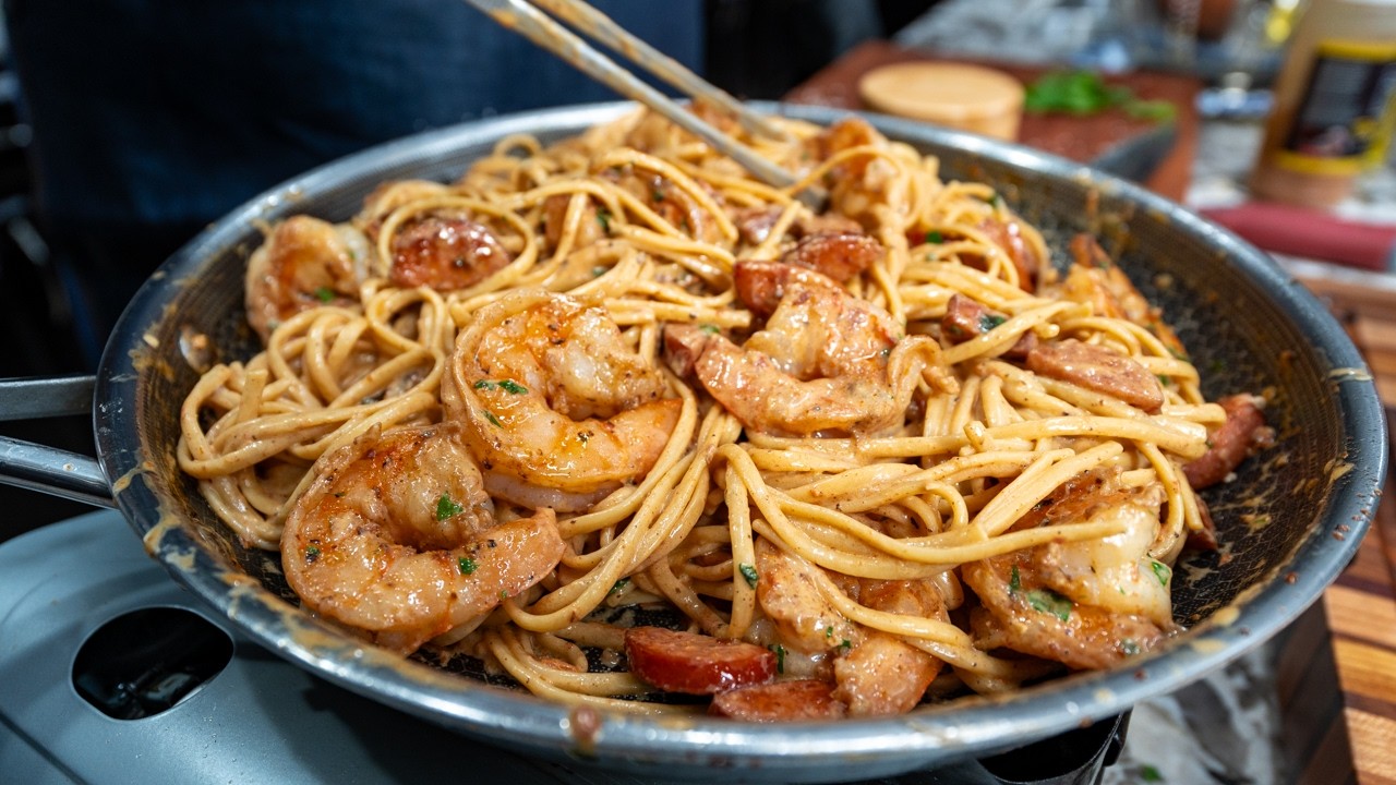 Today we’re making a Shrimp & Sausage Linguine that’s super quick, super easy, and tastes like something you’d order at a spot you gotta dress up for. Tender shrimp, smoky andouille sausage, and a creamy Parmesan sauce that grabs onto that linguine the right way. Get the printable recipe: https://smokinandgrillinwitab.com/shr... If your like this video and would like to see more don't forget to like, share, and subscribe and hit the bell for a notification of the latest video. For printable recipes click here: https://smokinandgrillinwitab.com/ Products: SnG Food Thermometer - https://shorturl.at/bquFN Seasonings and Rubs: AB's BBQ Rub - https://shorturl.at/hwJV5 AB's Burger Rub - https://shorturl.at/hrABH All Purpose Seasoning: https://shorturl.at/prtH0 The Level Up Series A Rub: https: //shorturl.at/oyAHR The Level Up Series B Rub: https: //shorturl.at/ctET4 The Level Up Series Bundle: https: //shorturl.at/ptDFX Best selling cookbooks: Best of Both Worlds Cookbook: https://shorturl.at/elCJ2 Taking the Mystery out of Cooking: https://shorturl.at/djDHU Smokin' and Grillin' with Aaron Brown: https://amzn.to/3UOasxh "Subscribe and hit the bell for new recipe alerts!" Online YouTube Store - https: //shorturl.at/hmpX6 SUBSCRIBE FOR MORE ►► PERKS for YOUTUBE MEMBERS "For just $5, unlock bi-weekly recipes, private live streams, exclusive content (TBD), and get credited in our videos. Become a YouTube member today! Thank you in advance!". So Join Smokin' and Grillin' wit AB now! - https://shorturl.at/aftEN My Amazon Store https://www.amazon.com/shop/smokingri... *** Video Gear and Links *** My Gear Camera 1: Sony FX3 - https://amzn.to/4abedkI Camera 2: Sony A7 - https://amzn.to/3Uu8eBT Prime Lens: Zoom Lens: Mic (Sennheiser Pro Audio EW-DP): https://amzn.to/4aeswFl Desk Mic: http://amzn.to/2GRHbcn Lighting (Aputure 300D Mark II): https://amzn.to/3URJOnh Social Media Facebook: / smokinandgrillinwitab Instagram: / smokinandgrillinwithab Tik Tok: / smokinandgrillinwithab Pint
