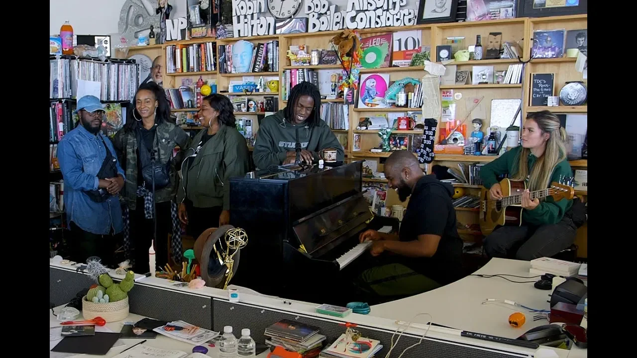 June 4, 2018 | Bobby Carter -- Daniel Caesar and his band had a clear vision for their Tiny Desk performance. While already confined to a small space, they opted to congregate at the piano, where producer and music director Matthew Burnett sat to create what feels like a fly-on-the-wall moment. We're presented a purity that's nearly impossible to capture on an album. The success of Caesar's debut LP, Freudian, has created a groundswell of fanfare and exposure for the 23-year-old singer-songwriter. It was nominated for two Grammys and won two Junos (Canada's equivalent to the Grammys). We've seen him perform on Late Night with Seth Meyers, pop stars are serenading him with his own songs and his set at this year's Coachella festival was one of the most buzzed about (behind the queen Bey, of course). Caesar's is an organic ascent that's yet to reach its peak. Caesar carries a coy aura about him, until he opens his mouth to sing. The years of training in church, fused with natural talent, is on full display. Supporting vocalists Camille Harrison, Danah Berry and Nevon Sinclair are in tow for the whole ride, providing some of the richest harmonies we've heard at the Tiny Desk. I found myself fixated on the playful manner in which the band members interacted with each other. Caesar didn't hold back with the set list. He performed his three most-streamed songs (a combined 249,000,000 plays on Spotify alone), including "Best Part," which included a Tiny Desk guest appearance by NPR Music favorite H.E.R. Set List "Japanese Denim" "Get You" "Best Part (feat. H.E.R.)" MUSICIANS Gabriella Wilson (H.E.R.), Ashton Simmonds (Daniel Caesar), Adrien Bent (Drums), Saya Gray (Bass), Matthew Burnett (Piano), Nevon Sinclair (Vocals), Danah Berry (Vocals), Camille Harrison (Vocals) CREDITS Producers: Bobby Carter, Morgan Noelle Smith; Creative Director: Bob Boilen; Audio Engineer: Josh Rogosin; Videographers: Niki Walker, CJ Riculan, Kara Frame; Photo: Morgan Noelle Smith/NPR.