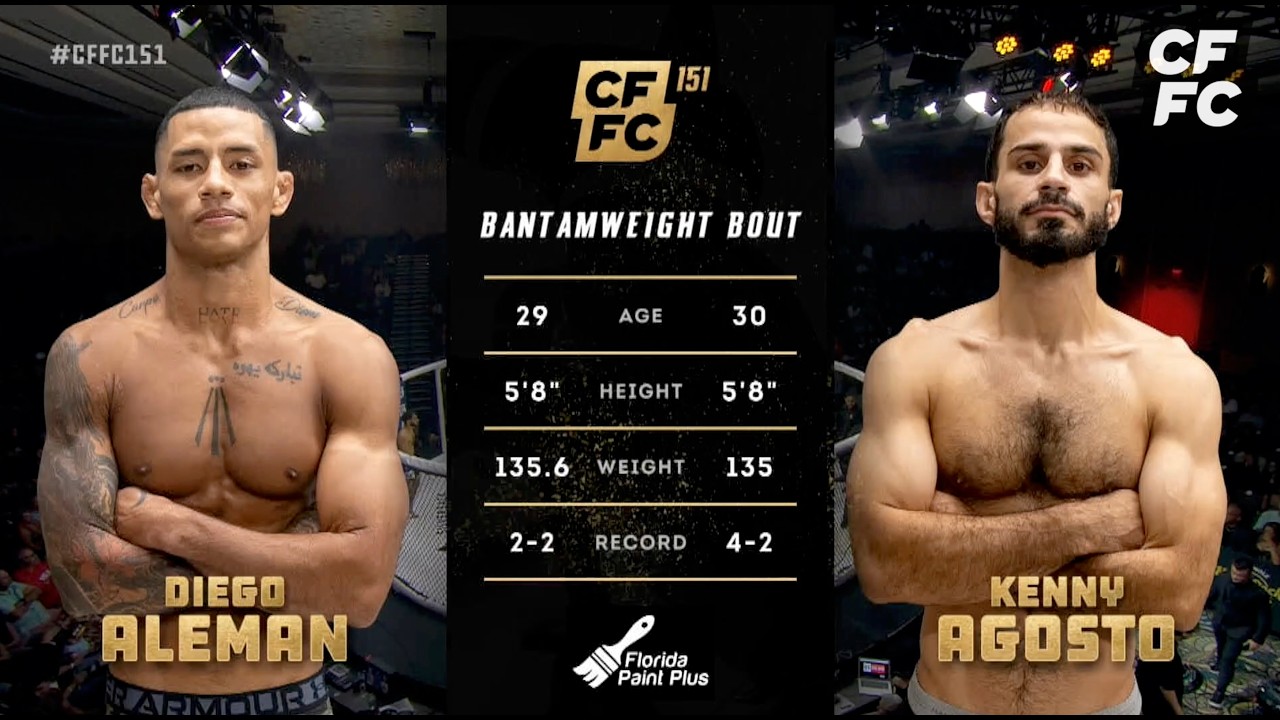 Diego Aleman and Kenny Agosto met in a featherweight bout on the preliminary card at CFFC 151, which took place at Florida's spectacular Seminole Hard Rock Hotel & Casino. John Morgan and Michelle Waterson-Gomez called the action live. Check out the rest of the night's preliminary action on the Cage Fury Fighting Championships YouTube channel. To see the night's six-fight main card, head to UFC FIGHT PASS. Catch the full replay on UFC FIGHT PASS: https://ufcfightpass.com/video/932676 Subscribe for full fight coverage, highlights, and exclusive CFFC content. #cffc151 #cagefury