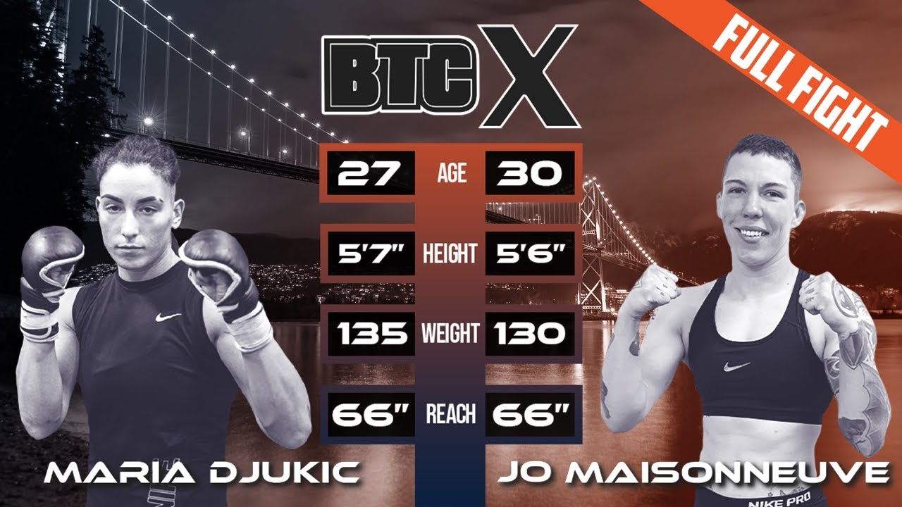 Technical striker Maria Djukic makes her pro debut against decorated grappler Jo Maisonneuve who has taken time during the pandemic to round out her skillset and drastically improve her striking 0:00 - Intro 1:34 - Tale of the Tape 3:07 - Round 1 9:17 - Round 2 15:31 - Round 3 22:35 - Winner Announcement BTC X June 5th, 2021 | BMO Theatre Centre | Vancouver, BC Commentary by Jason Hagholm and Josh "The Gentleman" Hill Website: https://btcfight.ca Instagram: https://instagram.com/btcfight FaceBook: https://facebook.com/btcfight TikTok: https://tiktok.com/@btcfight