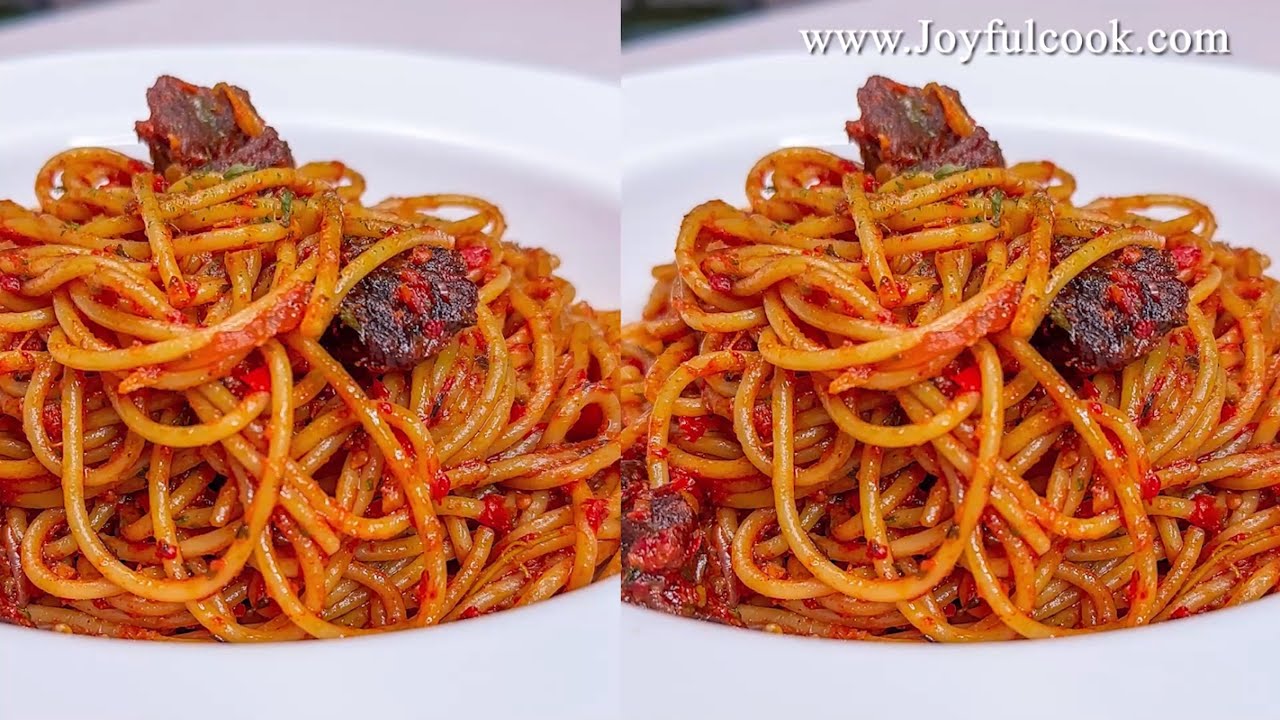 My instagram 👉🏽https://www.instagram.com/reel/DFiJkd... Written recipes👉🏽 joyfulcool.com List of ingredients Spaghetti Bell peppers Onion Spring onions Garlic and ginger Seasoning Oil Seasoning herbs Goat meat Smoked paprika