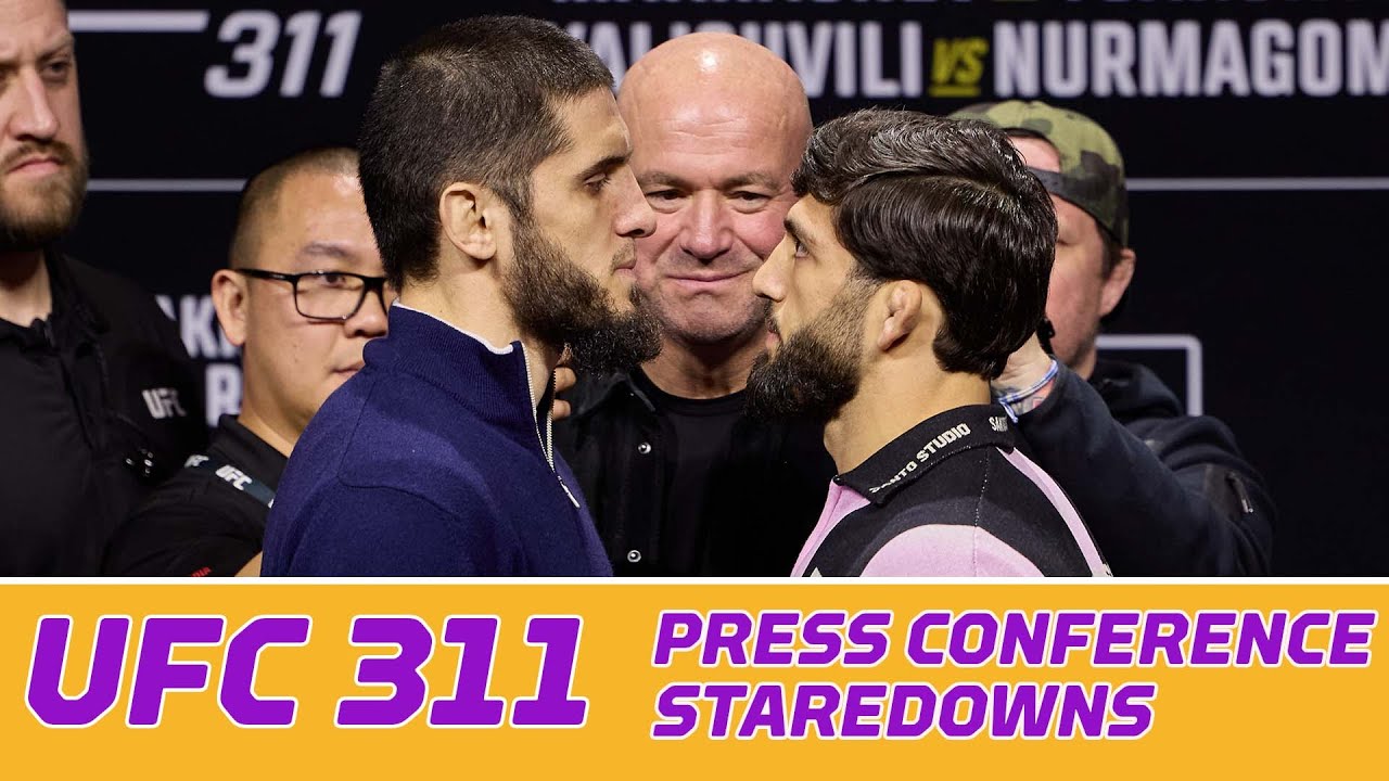 Islam Makhachev and Arman Tsarukyan shared a tense faceoff ahead of their fight at UFC 311 while UFC CEO Dana White made sure to keep Merab Dvalishvili and Umar Nurmagomedov separated when they came face-to-face following the pre-fight press conference. Join this channel to get access to perks: https://www.youtube.com/cha.../UC4f1JueVgo5t9HSmobCRPug/join Subscribe to MMA Fighting on YouTube: http://goo.gl/dYpsgH Subscribe to MMA Fighting feed on iTunes: https://podcasts.apple.com/.../mma-fighting/id320642139 Check out our full video catalog: http://goo.gl/u8VvLi Visit our playlists: http://goo.gl/eFhsvM • Like on Facebook: https://mma-fighting.visitlink.me/jXx747 • Follow on X: https://mma-fighting.visitlink.me/oHZAG3 • Follow on Instagram: https://mma-fighting.visitlink.me/eZP5ff • Follow on TikTok: https://mma-fighting.visitlink.me/DZzQ3W • Follow on Threads: https://mma-fighting.visitlink.me/pJJ2xj • Follow on Bluesky: https://mma-fighting.visitlink.me/GIxe-N • Subscribe on Twitch: https://mma-fighting.visitlink.me/nSjCJV Read More: http://www.mmafighting.com MMA Fighting is your home for exclusive interviews, live shows, and more for one of the world's fastest-growing sports. Get latest news and more here: http://www.mmafighting.com See less