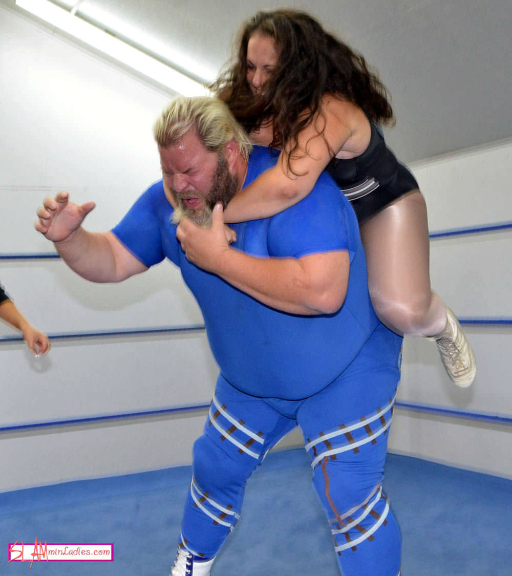 You’d think this match might be a tad one-sided but then you wouldn’t be taking into account the somewhat partisan and definitely aggressive refereeing of Su Yung, who had her own match back in SLAMpeg 1227 and has reason to be biased. Su thwarts Freight Train at every step, throwing a wrench into what might have been a relatively easy victory for the big man. Freight Train gets in a couple decent counters, busting out of a piggyback choke and cinching Little Jeannie into a Bearhug, but both times, Su intervenes, giving Jeannie time to recover. But as soon as Jeannie starts getting in a few hits, Su Yung’s pacifism dissipates. Quite the opposite–she openly joins Little Jeannie in dishing out the punishment. Chokes on the rope, a groin-stretching wishbone move, hairpulling, Dropkicks...the two women double-team him without shame. As the inevitable occurs and Freight Train crashes to the mat for the last time, they even take turns posing over his prone body and walking all over his stomach. Not the most dignified outing for Freight Train.