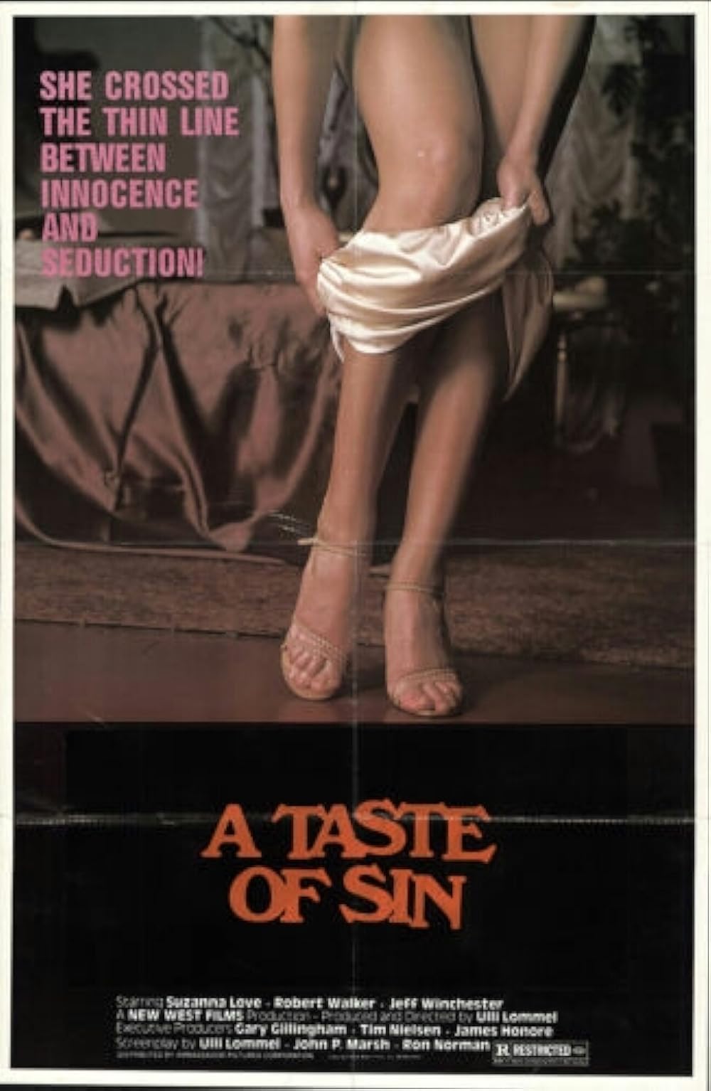 My review was written in March 1983 after a screening in the Bronx. Filmed half in London and half in Arizona in 1981 with the shooting title "Faces of Fear", "A Taste of Sin" is an effective psychological horror thriller from prolific Germany-to-U;S. Filmmaker Uli Lommel. Biggest treat her for film buffs and horror fans is Lommel's equal-time raiding of not merely the works of Alfred Hitchcock, but also the Hitchcock-derived thrillers of Brian DePalma. Prior to its present (tacked-on to suit a sex-themed ad campaign) moniker, picture bore a series of better titles: "Beyond the Bridge", "Double Jeopardy" and "Olivia". Opening (culled from Hitchcock's "Marnie") has 6-year-old Olivia (Amy Robinson) watching (through a keyhole) her British prostitute mother servicing a G. I. who's into bondage. She helplessly sees her mom killed by the G. I. Fifteen years later, Olivia (played as an adult by Suzanna Love, star of all even of Lommel's U. S.-made pics) has a British husband Richard (Jeff Winchester), and dresses up at night to relive her mom's experience as a streetwalker near London Bridge. Controlled by her (imagined) mom's voice from beyond the grave, she starts killing her customers while being wracked with guilt for not coming to mom's aid versus the G. I. Olivia falls in love with Michael Grant (Robert Walker), an American working on a project to restore the bridge. In a fight with Richard over her that takes place on the bridge, Grant is victorious, and Richard ends up hurtling into the water below. With the film half over, scene shifts to Arizona four years later where London Bridge has been transplanted (along with its fatalistic associations for the lead characters). Grant finds Olivia working as a condominium saleslady using a new name (Jenny) and with a new mousy appearance and American accent. Suspenseful plot twists (and red herrings) involve lifts from "Vertigo", "Obsession", "Sisters","Psycho" -you name it. Though this type of derivative filmmaking is hotgly criticized these dys (with DePalma perhaps the number one whipping boy), Lommel plays it straight and comes up with an entertaining B picture. He obviously enjoys the Hitchcock association, even casting Vera Miles from "Psycho" in his next film "Brainwave" (opposite Tony Curtis instead of Janet Leigh) and recalling Walker (son of "Strangers on a Train" namesake and near lookalike) for the lead in "Devonsville Terror". Suzanna Love is quite impressive in the chameleon lead role, calling for at least three distinct personalities. Walker, still looking boyish at age 40, is an empathetic hero, though one keeps expecting him to become sinister, given Hitchcok's switcheroo casting of his dad 30 years earlier. Joel Goldsmith's synthesizer music score is effective, but the film is hampered by drab would-be film noir visuals, for which five cinematographers are credited.