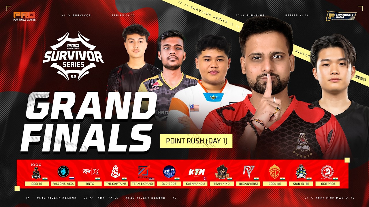 🔥 PRG Survivor Series S2 | Grand Finals DAY 1 - Point Rush 🔥 Welcome to the official PRG Survivor Series S2 Grand Finals Day 1 livestream! Get ready for intense Free Fire Max action as top squads battle it out for a spot in the next stage of the tournament ⚔️ Stream Details: 🎮 Game: Free Fire Max 📍Tournament: PRG Survivor Series S2 🏆 Stage: Grand Finals (Day 1) 📺 Live Coverage: Official PRG Broadcast 📅 Date: 30/03/2026 (Monday) ⏰ Time: 03:00 PM IST 1. IQOO TG 🇮🇳 2. TEAM FALCONS 🇹🇭 3. S8UL ELITE 🇮🇳 4. GODLIKE 🇮🇳 5. GDR PROS 🇮🇳 6. TEAM EXPAND 🇲🇾 7. TEAM HIND 🇮🇳 8. RNTX 🇮🇳 9. KATHMANDU ESPORTS 🇳🇵 ( xDoctor Army) 10. REAGANVERSE 🇮🇳 11. THE CAPTAINS 🇮🇳 12. OLD.GODS 🇮🇳 Good luck Survivors! 💪🏆 Follow @playrivalsgaming on IG for more! #PRGSurvivorSeries #FreeFireMax #GrandFinals #EsportsIndia #LiveEsports #BattleRoyale #GamingLive #tournaments #CompetitiveGaming