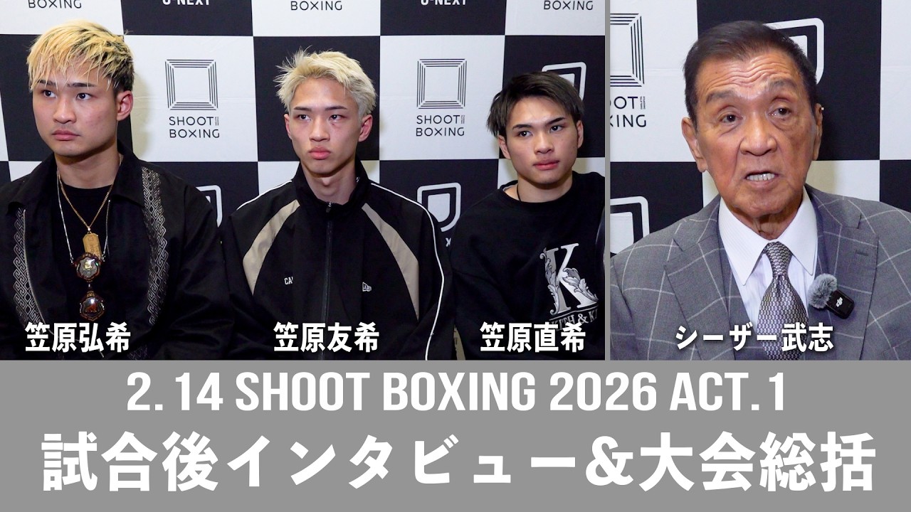 2026年2月14日、東京・後楽園ホールで行われた『SHOOT BOXING 2026 act.1』。 笠原弘希、笠原友希、笠原直希の試合後インタビューとシュートボクシング協会会長・シーザー武志の大会総括です。 試合結果はこちら⇒https://shootboxing.org/result/35421/ 『SHOOT BOXING 2026年大会スケジュール』 2月14日(土) SHOOT BOXING 2026 act.1 東京・後楽園ホール 3月29日(日) AMATEUR SHOOT BOXING TOKYO.28 ワンマッチ大会 東京・ゴールドジムサウス東京ANNEX 4月11日(土) SHOOT BOXING 2026 act.2 東京・後楽園ホール 5月10日(日) AMATEUR SHOOT BOXING TOKYO.29 ワンマッチ大会 東京・ゴールドジムサウス東京ANNEX 6月21日(日) SHOOT BOXING 2026 act.3 東京・後楽園ホール 8月22日(土) SHOOT BOXING 2026 act.4 東京・後楽園ホール 9月6日(日) AMATEUR SHOOT BOXING TOKYO.30 ワンマッチ大会 東京・ゴールドジムサウス東京ANNEX 10月24日(土) SHOOT BOXING 2026 act.5 東京・後楽園ホール 11月(仮) S-cup or GROUND ZERO 12月13日(日) AMATEUR SHOOT BOXING 2026 東京・ゴールドジムサウス東京ANNEX SHOOT BOXING https://shootboxing.org/ Twitter https://twitter.com/shoot_boxing Facebook https://www.facebook.com/shootboxing/ Instagram https://www.instagram.com/shootboxing_official/ #格闘技 #shootboxing