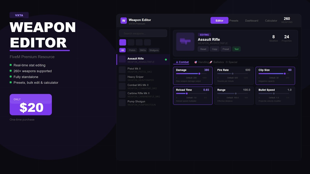 Thanks for watching the video, learning how to edit so this is pretty raw footage but if you liked the script join the discord and make a ticket, or add me and send a pm,. Tebex account is still being setup, once setup this can be transferred to your keymaster and ready for future updates! https://discord.gg/ymF9Cdv9 -DeadzoneRP My Discord - vita5074 VXTA Weapon Editor is a premium, fully standalone in-game weapon stat editor for FiveM. Authorized players can open a sleek NUI panel and modify any weapon's damage, range, fire rate, clip size, recoil, bullet speed, reload time, and more — all in real time with no server restart required. Changes are saved instantly to a JSON file and applied server-wide, so every player gets updated stats automatically. Sliders display real in-game default values pulled live from GTA's weapon metadata, not hardcoded guesses. Built with no framework dependencies — works out of the box on any server. --- Highlights: Real-time weapon stat editing with live in-game default values Preset system — save, load, and share configurations globally or per-weapon Bulk edit multiple weapons at once Import / Export configs as shareable JSON strings Built-in damage calculator — TTK, DPS, shots to kill, headshot stats Side-by-side weapon comparison tool Discord webhook logging for all edits Auto-backup system with configurable intervals 5 built-in UI themes Optional auto-detection of addon weapons via ox_inventory Fully standalone — no ESX, QBCore, MySQL, or any external resource required