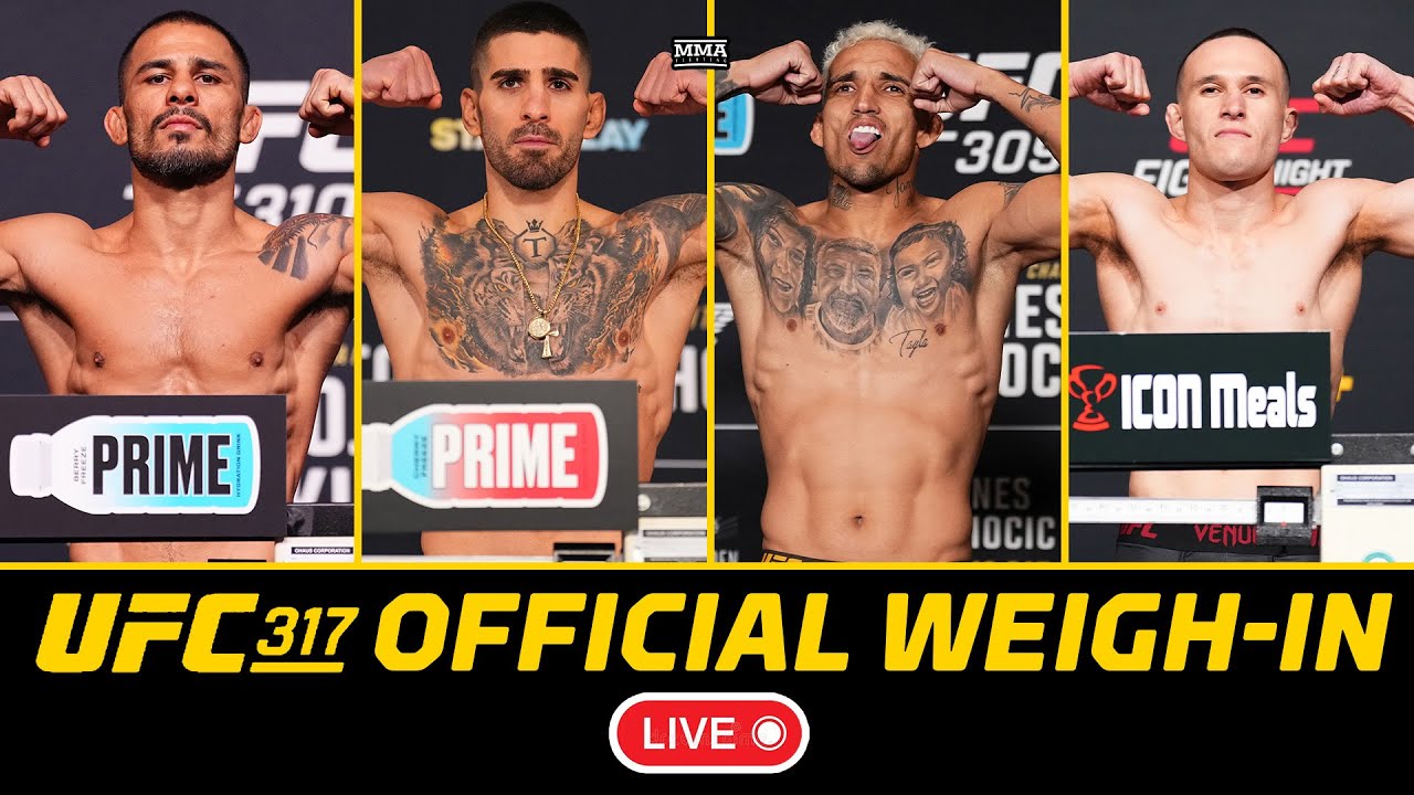 Watch #UFC317 main and prelim cards fights, including #iliatopuria and #charlesoliveira, weigh-in ahead of their fights inside the T-Mobile Arena in Las Vegas. 🔵 Join this channel to get access to perks: https://www.youtube.com/channel/UC4f1JueVgo5t9HSmobCRPug/join 🔵 Subscribe to MMA Fighting on YouTube: http://goo.gl/dYpsgH 🔵 Subscribe to MMA Fighting feed on iTunes: https://podcasts.apple.com/us/podcast/mma-fighting/id320642139 🔴 Check out our full video catalog: http://goo.gl/u8VvLi 🔴 Visit our playlists: http://goo.gl/eFhsvM 🔗 Like on Facebook: https://mma-fighting.visitlink.me/jXx747 🔗 Follow on X: https://mma-fighting.visitlink.me/oHZAG3 🔗 Follow on Instagram: https://mma-fighting.visitlink.me/eZP5ff 🔗 Follow on TikTok: https://mma-fighting.visitlink.me/DZzQ3W 🔗 Follow on Threads: https://mma-fighting.visitlink.me/pJJ2xj 🔗 Follow on Bluesky: https://mma-fighting.visitlink.me/GIxe-N 🔗 Subscribe on Twitch: https://mma-fighting.visitlink.me/nSjCJV Read More: http://www.mmafighting.com MMA Fighting is your home for exclusive interviews, live shows, and more for one of the world's fastest-growing sports.