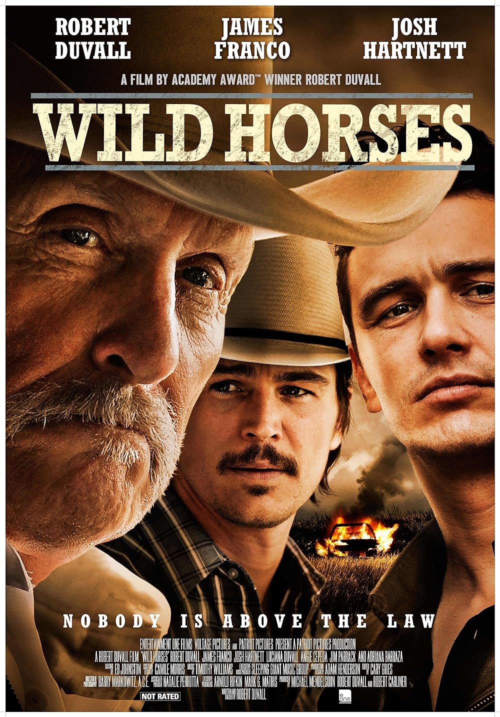 Those seeking for a detective movie might be disappointed. Wild Horses is first and foremost a family drama, while the investigation part takes secondary priority. It provides solid emotional scenes, mainly thanks to the veteran cast and the personal premise, although the pace is unfortunately slow. It may not appeal to anyone since it will take nearly an hour before the momentum actually builds up, furthermore the crime element is considerably weak. Story follows the sheriff from small desert town who opens a cold case concerning a missing boy. It happened fifteen years ago, so understandably it rattles some people, especially the Briggs family. It becomes clear early on that Luciana Pedraza as the sheriff is not in the same league as the rest of the cast, which is unfortunate since her perspective, while not in the same volume of the family's, is still crucial to the plot. Additionally, there is very thin material for the crime aspect, it could have been skimped to minor subplot, yet the movie invests quite a lot on the police angle. The rest of the time is focused on dialogues in the Briggs family. The Briggs are very rich family and very patriarchy, they also harbors a lot of secrets. Duvall plays as Scott, the head of the family and he delivers a very convincing performance. He keeps the interest of his family first, although this might collide with the tragedy of the past. Josh Hartnett has added depth on his character. He looks straightforward or rigid, but can also be passionately aggressive. The youngest son Ben is played by James Franco and he might be hust the nicest and honest amongst all. Between the three of them the acting is highly presentable, but since the screenplay consists of slow pace conversations, it can be tedious at times. It has the good intention on delivering very private issue by the perspective of an entire family. However, the inconsistent delivery and tired pacing might not be refined enough to deliver the intended message.