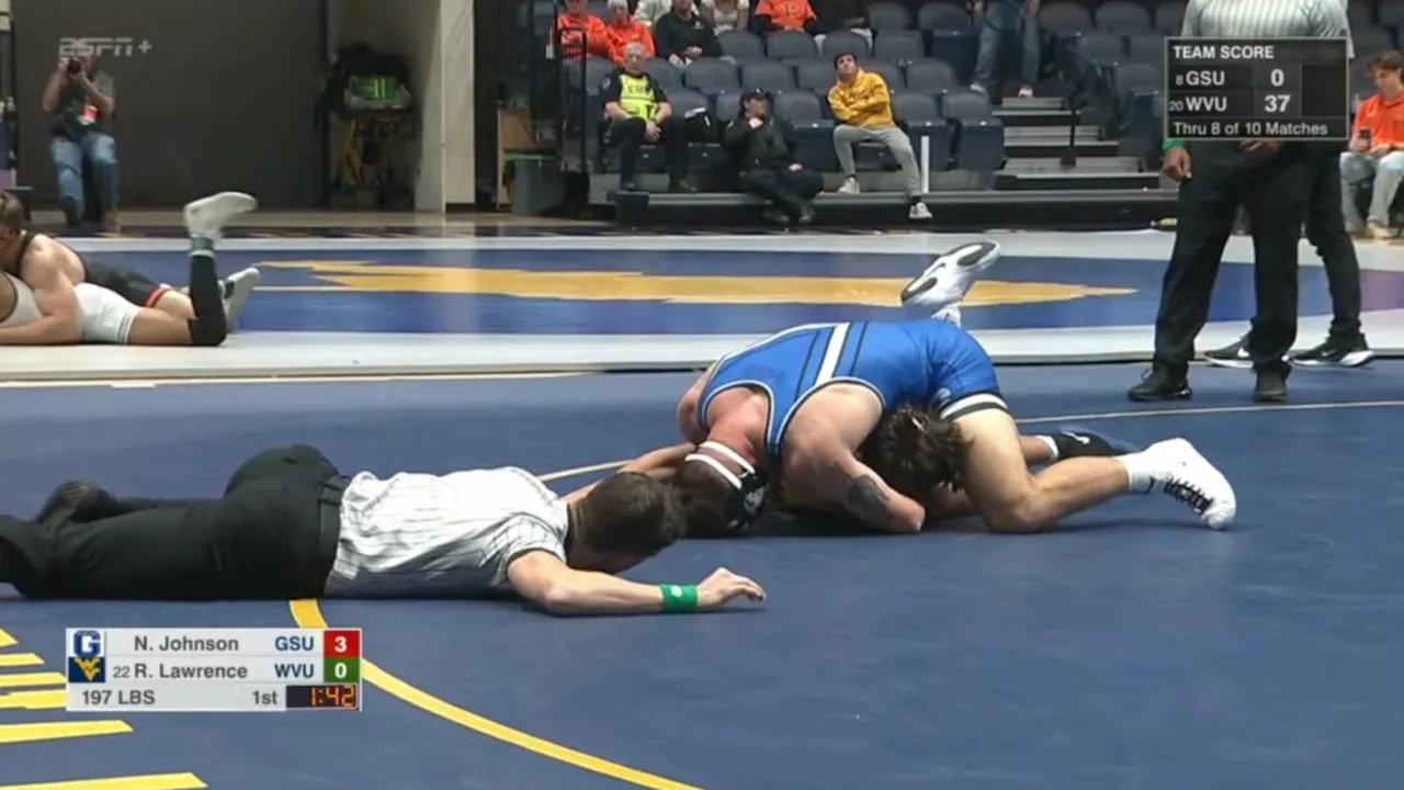 2025/26 West Virginia vs Glenville State wrestling dual 197lbs Nicholas Johnson (GLST) fall #26 Rune Lawrence (WVU) I do not own this video, all credit/rights to ESPN/Big 12
