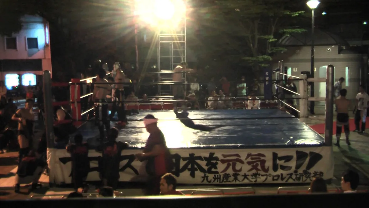 2015/10/8【4】第40回中洲まつり 1日目 メインイベント 1-2 =九州産業大学プロレス研究部= 喰霊斗たむ 遠賀大吉 卑愚悶 vs ジャパネット田中 天草ちろう デストラD