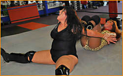 A 1 Fall match-up between Big Red and the dark haired vixen from Britain. The ladies seem reluctant to lock up but once they do they exchange holds and quips back-and-forth. April discovers that Pandora is pretty flexible as she gets her into some interesting holds. Neither wrestler can get the upper-hand as they keep countering the other's moves. After a long Headlock April finally escapes and unleashes a flurry of quick fists and a long Surfboard variety. A quick rollup decides this one but in whose favor (or should we spell it favor for Pandora)?