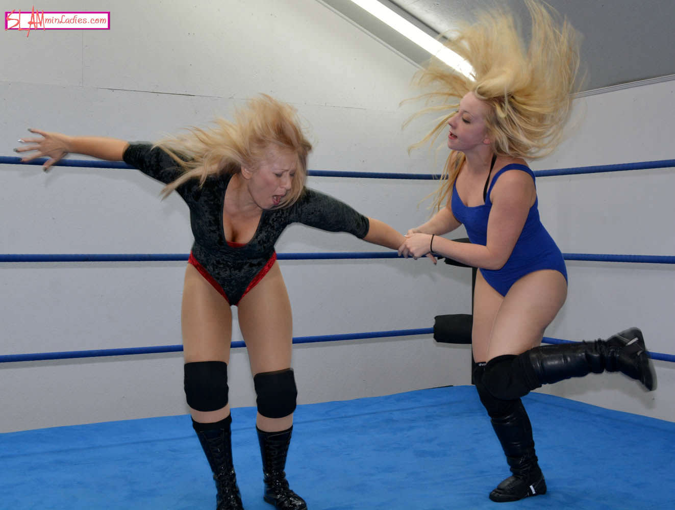 Brandi and Kimber bring the goods in this fast paced, back and forth affair. The two blondes break out a variety of holds in search of that elusive submission. It's Kimber who is stretched out first, taking a double-toed leglock, Surfboard and Full Nelson. Kimber connects with a Snapmare, but Brandi has an answer for everything. She turns a Chinlock into a Hammerlock, a front Headlock into a sweep and a reversed Figure Four Leglock back into a Figure Four Leglock of her own! Nothing comes easy for either wrestler. Brandi fights out of a toehold and bodyscissors while Kimber nearly succumbs to a Dragon Sleeper and some vicious armlocks. After Brandi is trapped in a leglock nelson, she escapes and tops Kimber's effort with a modified version of the same maneuver. Neither woman is willing to submit. The only way to end this is with a knockout. A python-like Sleeperhold leaves no doubt as to who the winner is.