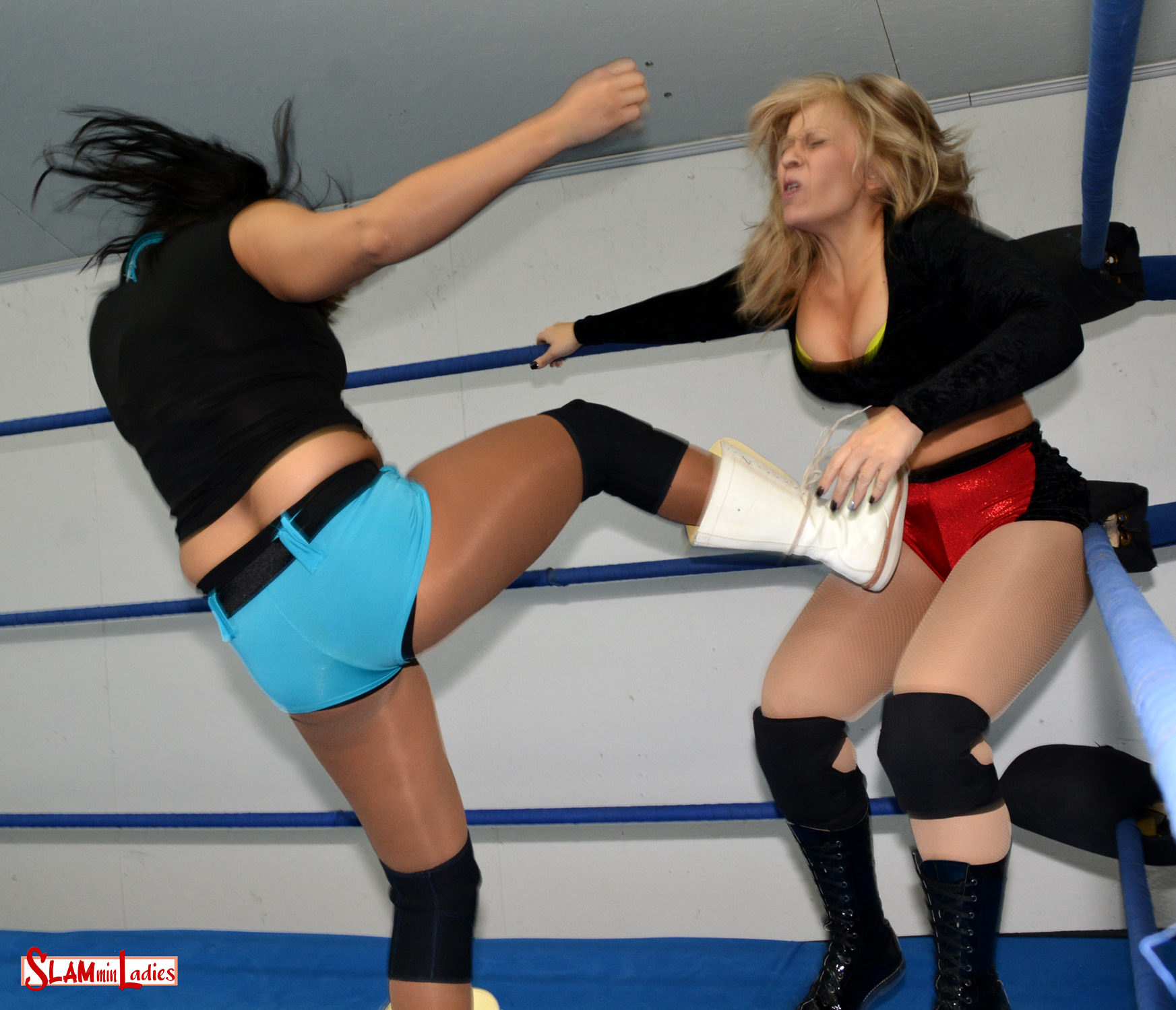 We've heard wrestlers tell their opponents they're not good enough to lace up their boots, but Su takes that saying to a whole new level. She shows up for her match against Brandi with boots undone, which is enough of a distraction to give Su an opening for a sneak attack! Su taunts Brandi, demanding that she lace up her boots for her as she chokes her in the corner. Laced up or not, nothing stops Su from putting the boots to Brandi as she kicks her stomach and thighs. Brandi eventually has enough and she takes Su down with an anklelock. The leg prove to be a tempting target and Brandi slams Su's against the mat, wraps it around the bottom rope, and twists it in a toehold. A Bodyslam nearly gets Brandi the win, but it's actually Su who hits a DDT out of nowhere for the 3 count! The action doesn't stop there, because just when Su thinks she has time to finally put her boots on properly, Brandi surprises her with a Headscissors. Brandi chokes Su out and removes a boot for a nasty post-match attack, before claiming the gear as a trophy.