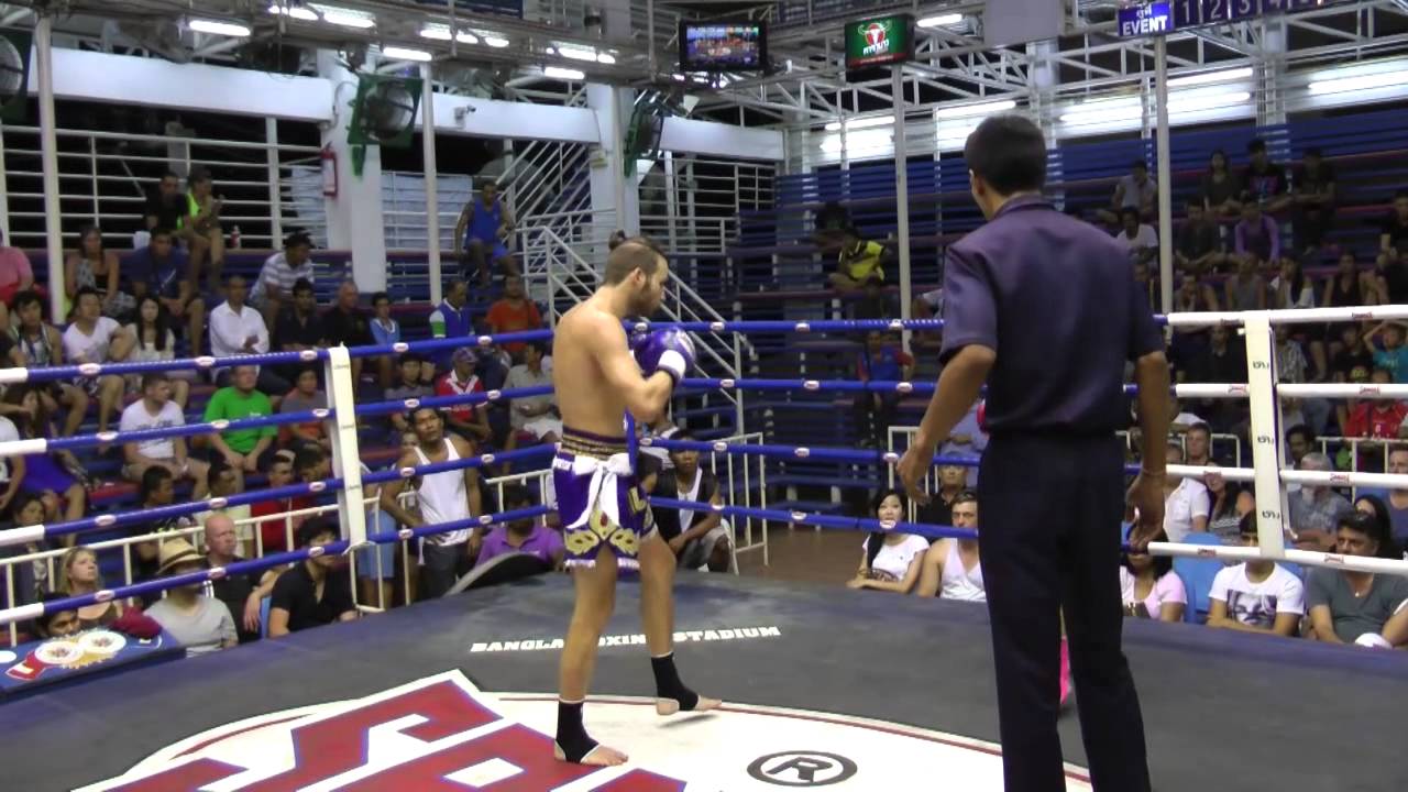 http://www.sinbi-muaythai.com - Cain fights a guy from France and after punishing him with leg kicks and punches his corner stops the fight.