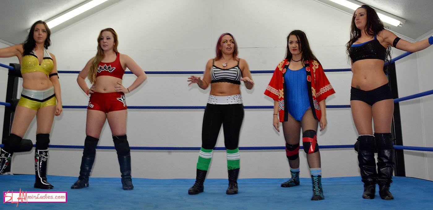 In her role as referee, Solo Darling is the only solo woman for this 1 fall tag team bout between The Kimber Bombs and the team of Santana and Su. As the match begins, Santana and Su Yung dominate the early proceedings, working well as a unit to keep the Bombs on the defensive. However, it isn’t long before the more established team begin to take control of the action. Successfully isolating Su in the ring, Cherry and Kimber work her over both individually and (when Solo is sometimes distracted) doubleteaming the outnumbered wrestler. Santana does her best to help, but sometimes does more harm than good, taking Solo’s attention from the action in the ring. As Su continues to be punished in the ring, the result seems an inevitable one. But can the Bombs ensure the match goes with a bang? Or will Su and Santana finally defuse their dominance?