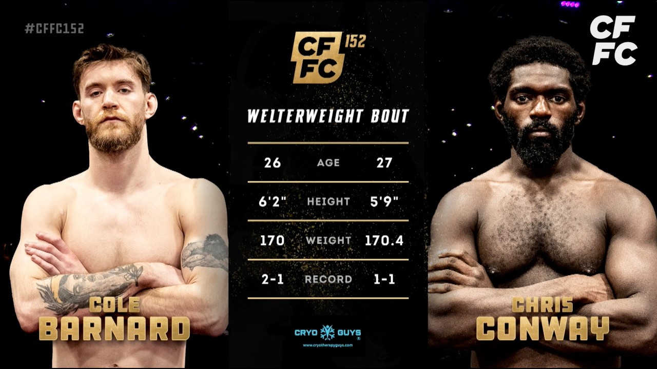 Cole Barnard and Chris Conway met in a welterweight bout on the preliminary card at CFFC 152, which took place at New Jersey's incredible Hard Rock Hotel & Casino Atlantic City. John Morgan and Josh Thomson called the action live. Check out the rest of the night's preliminary action on the Cage Fury Fighting Championships YouTube channel. To see the night's six-fight main card, head to UFC FIGHT PASS. Catch the full replay on UFC FIGHT PASS: https://ufcfightpass.com/video/939383 Subscribe for full fight coverage, highlights, and exclusive CFFC content. #cffc152 #cagefury