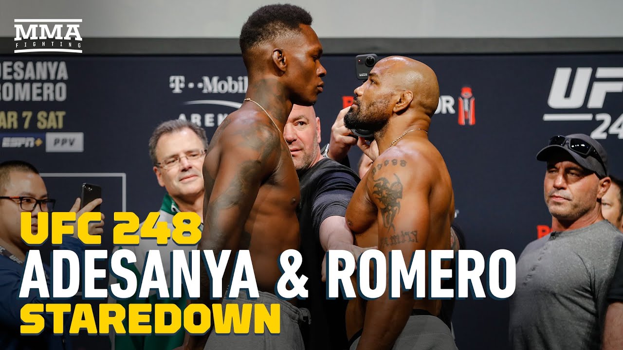 At UFC 248 weigh-ins, Israel Adesanya and Yoel Romero square off for the final time Friday evening in Las Vegas. Watch UFC 248 Stream: http://go.web.plus.espn.com/c/482924/595608/9070?sharedid=MMAFighting Subscribe: http://goo.gl/dYpsgH Check out our full video catalog: http://goo.gl/u8VvLi Visit our playlists: http://goo.gl/eFhsvM Like MMAF on Facebook: http://goo.gl/uhdg7Z Follow on Twitter: http://goo.gl/nOATUI Read More: http://www.mmafighting.com Subscribe to the podcast: http://applepodcasts.com/mmahour MMA Fighting is your home for exclusive interviews, live shows, and more for one of the world's fastest-growing sports. Get latest news and more here: http://www.mmafighting.com