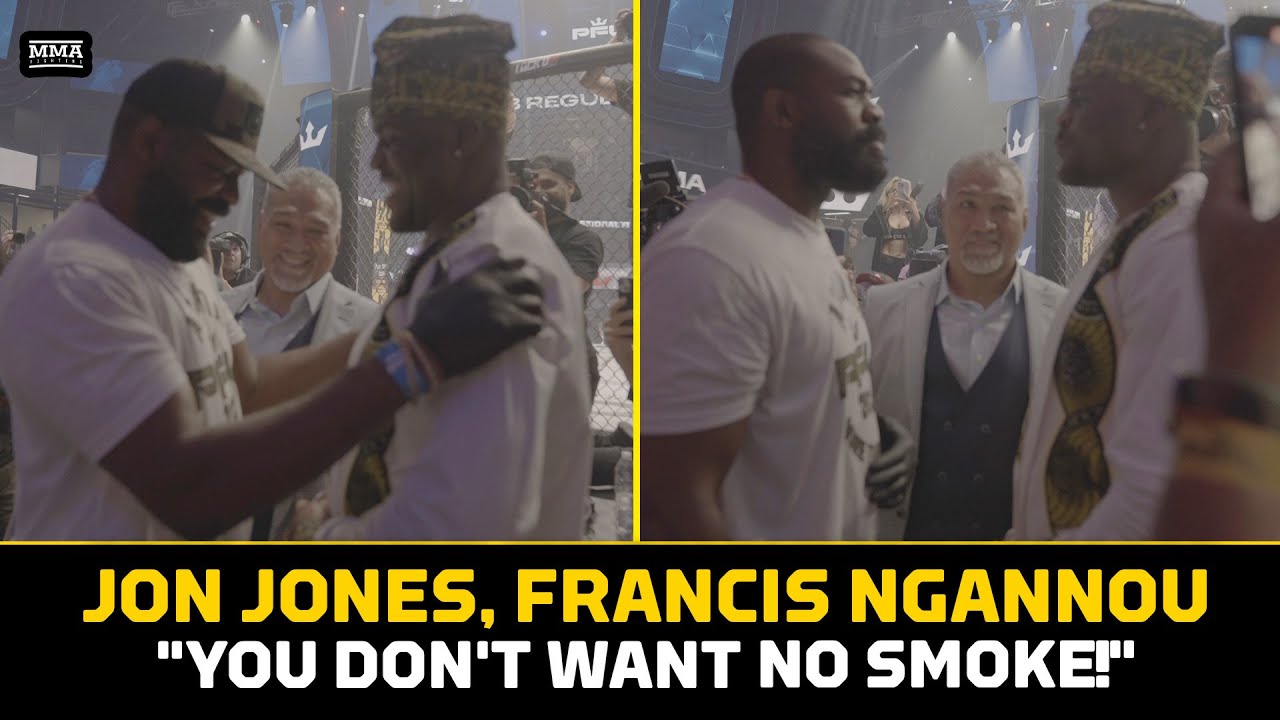 #JonJones and #FrancisNgannou have an impromptu face-to-face at PFL 5. Join this channel to get access to perks: https://www.youtube.com/channel/UC4f1JueVgo5t9HSmobCRPug/join Subscribe to MMA Fighting on YouTube: http://goo.gl/dYpsgH Subscribe to The MMA Hour on iTunes: http://Apple.co/themmahour Subscribe to The MMA Hour on Spotify: https://open.spotify.com/show/0NUQhyUeYQcbtHOV10qmbb Subscribe to MMA Fighting feed on iTunes: https://podcasts.apple.com/us/podcast/mma-fighting/id320642139 Check out our full video catalog: http://goo.gl/u8VvLi Visit our playlists: http://goo.gl/eFhsvM Like MMAF on Facebook: http://goo.gl/uhdg7Z Follow on Twitter: http://goo.gl/nOATUI Read More: http://www.mmafighting.com MMA Fighting is your home for exclusive interviews, live shows, and more for one of the world's fastest-growing sports. Get latest news and more here: http://www.mmafighting.com