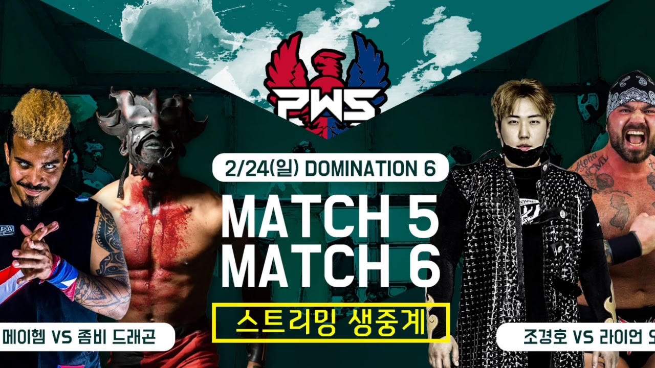 PWS DOMINATION6 LIVE! 2월 24일날 펼쳐진 PWS 월간 정기쇼 도미네이션 6의 라이브 스트리밍 입니다. 시호 VS 키드 레인 아담 메이헴 VS 좀비 드래곤 PWS 챔피언쉽 라이언 오션 VS 조경호 VS 레오 리버프