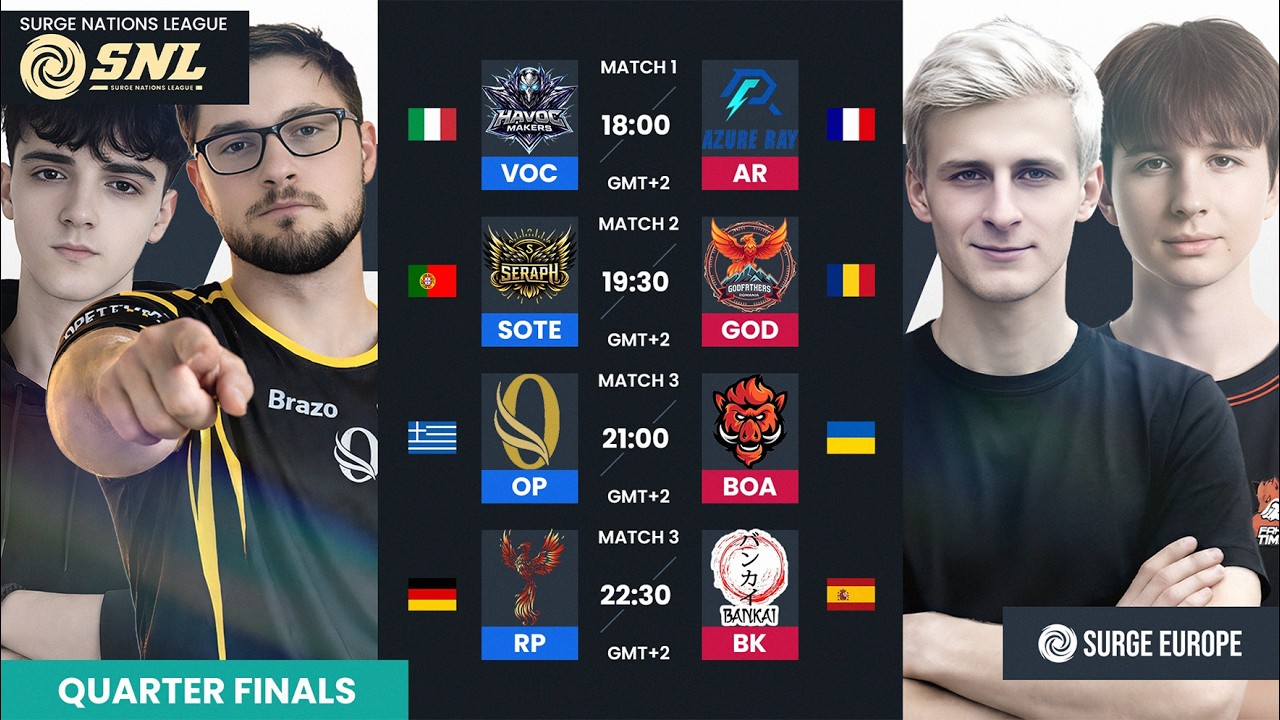 SURGE NATIONS LEAGUE SEASON 1! ЁЯПЖ ЁЯЧУя╕П Today's Schedule GMT+2 - Quarter Finals M1: 18:00 - Quarter Finals M2: 19:30 - Quarter Finals M3: 21:00 - Quarter Finals M4: 22:30 Stay connected and follow us on social media for updates, highlights, and more: ЁЯМН Linktree: https://linktr.ee/surge_europe ЁЯТм Discord: https://discord.gg/TTrzu8UGAy ЁЯУ╕ Instagram: https://www.instagram.com/surge_europe/ #mlbb #mlbbeurope #mobilelegends #surgeeurope #surge #gaming #moba #legends #mlbbtournament #esports #esport #esportseurope #mobile #mobilegaming #spl #playoffs #emea